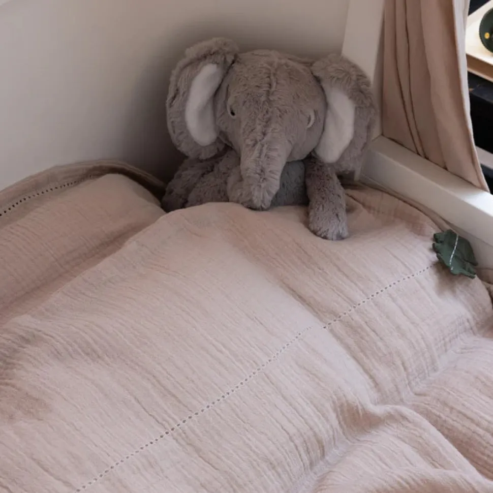 Sengetøjet består af to lag musselin, der krøller på den helt rigtige måde og kun bliver mere lækkert efter vask. Rundt i kanten på dynebetrækket og tværs over pudebetrækket er der en sød pynte-hulsøm, og som en ekstra detalje har dynebetrækket et lille blad påsyet, der fungerer som nulreflap til små søvnige fingre.