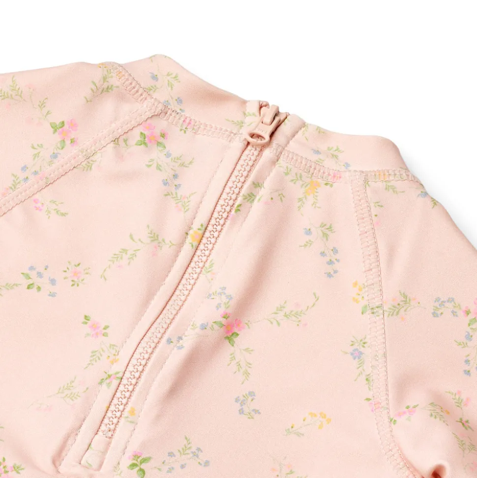 Badedragten er tætsiddende og har en lille krave for at beskytte nakken mod solen og raglanærmer. Den har en lynlås i ryggen for at gøre det nemt for dig at klæde din baby på. Stilen har UV 40+/UPF 40+ beskyttelse og er OEKO-TEX® certificeret. Badedragten kan let styles med en af vores lette kjoler eller skjorter for at fuldende det søde sommerlook.