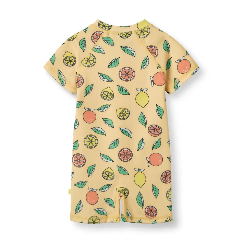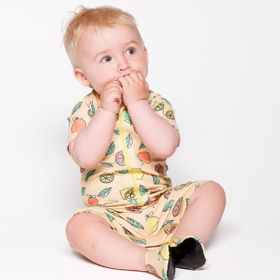 Tilføj et frugtigt præg til din babys badetøj med dette muntre print af friske citroner og appelsiner, perfekt til solrige strand- eller pooldage! Småfolks print er skabt med glade farver, detaljer og historier i tankerne. Badetøjet tilføjer personlighed til dit barns garderobe og sikrer komfort hele dagen.