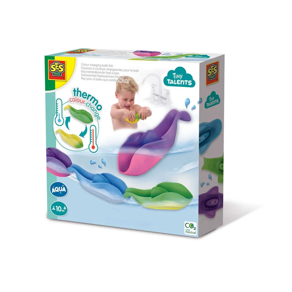 3 fisk som skifter farve når de kommer kontakt med vand! Den grønne skifter farve til gul, den blå skifter farve til hvid og den lilla skifter farve til lyserød. De er sjove at lege med, og de kan hægtes på hinanden. Når man er færdig med badet, kan de stables.