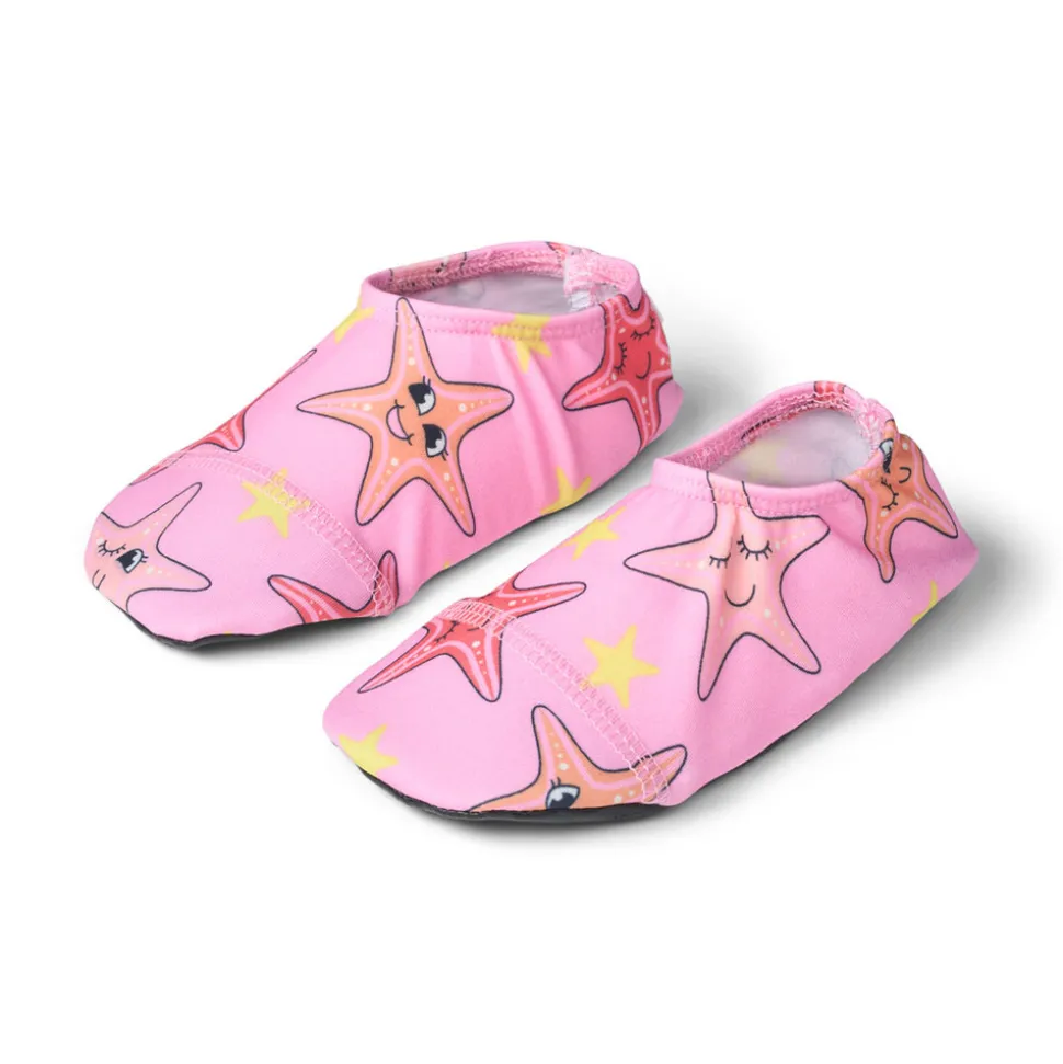 Småfolks badetøj beskytter dit barns hud med UPF50+ UV-faktor indvævet i stoffet. Badeskoene har skridsikre såler og elastik ved anklen, hvilket beskytter dit barns fødder mod forbrændinger fra varmt sand og fliser ved poolen. Samtidig sikrer de skridsikre såler, at dit barn ikke glider.