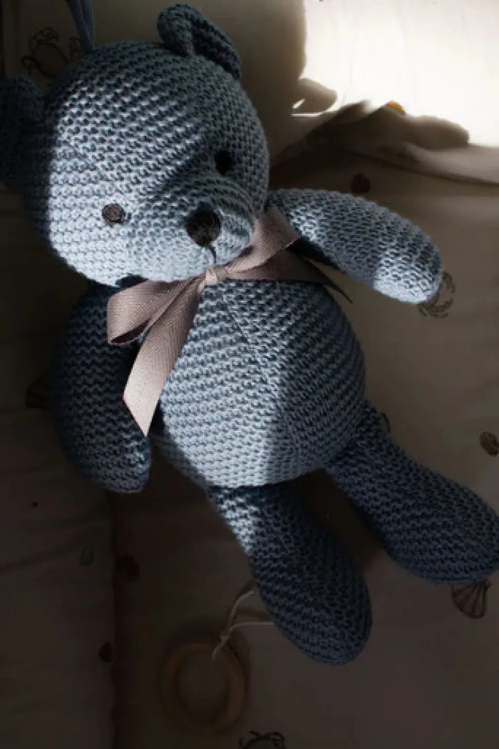 Blød strikket bamse med rolig musik. Bamsen er en kær og uimodståelig krammeven, og med sine dinglende arme og ben samt søde smil, bliver den hurtigt en af barnets yndlings bamser. Træk i træringen og bamsen vil spille den fineste, klare og rolige vuggevise “Sleep baby sleep”, som kan få enhver baby til at slappe af.