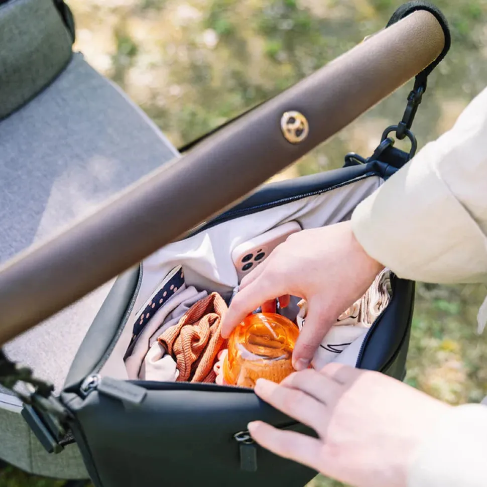 Denne barnevognstaske er en praktisk og stilfuld måde at holde orden på dine og dit barns vigtigste ting og gøre dem let tilgængelige. Den fastgøres nemt til barnevognens håndtag ved hjælp af barnevognskrogene.