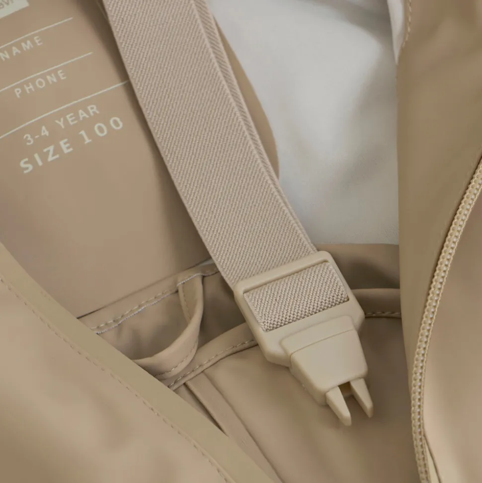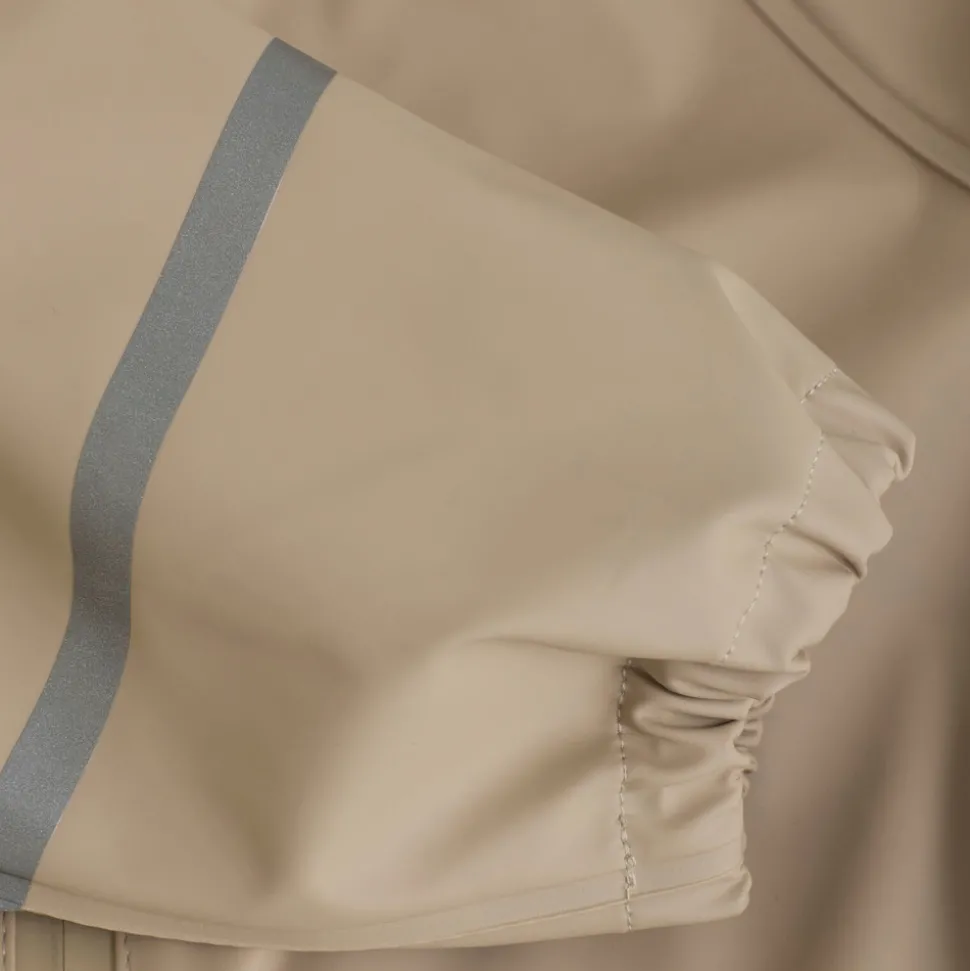 Jakken har elastik ved håndleddene, hætten og taljen som holder vand og luft ude. Reflekser på det ene ærme og det ene ben, samt reflekslogo på ærme, hætte og ben. Disse reflekser er med til at gøre dit barn mere synlig i mørket.