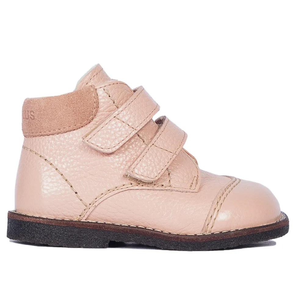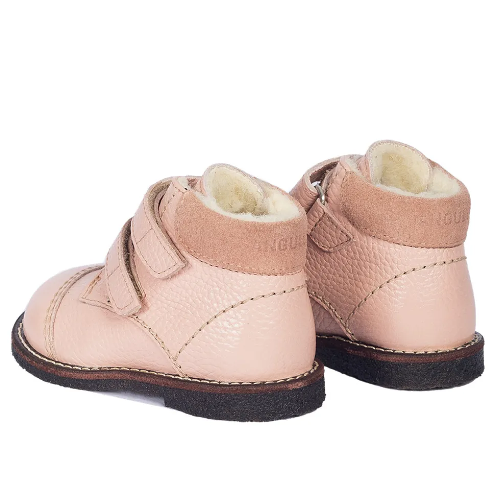 Begynder velcrosko med rummelig pasform, merino uldfoer og dekorative kontraststikninger.