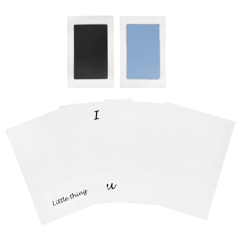 Indhold: 2 x blækpuder, 2 x hvidt papir, 2 x papir med pre-print