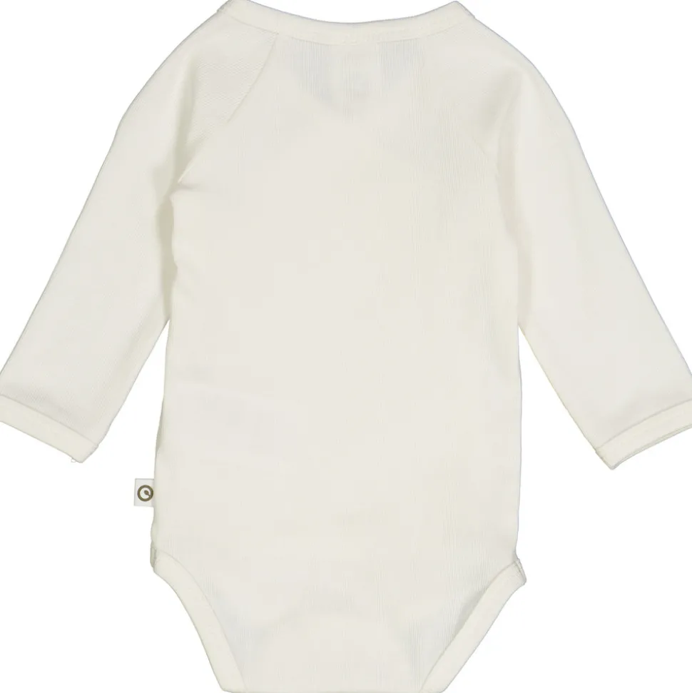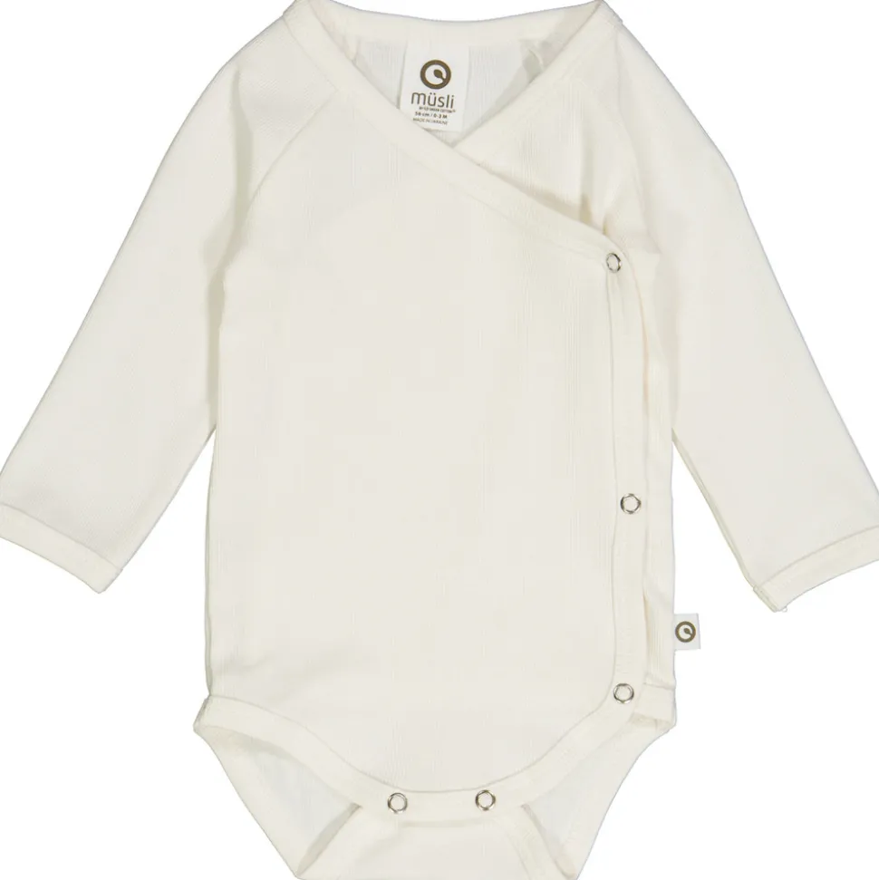 Dejlig blød rib body med kryds lukning. Bodyen kan åbnes helt op fortil med tryklåse så bodyen ikke skal ned over hovedet på baby. Bodyen har ydermere tryklåse i bunden. Denne body er lavet fra str. 44-74 og passer derfor til helt små babyer. Fremstillet i en dejlig blød bomulds rib med elastan. (GOTS Organic Certified by Ecocert Greenlife Lic. No. 152033). Produktet er GOTS organic- certificeret, hvilket betyder at bomulden er certificeret økologisk, og at der i alle andre processer som farvning, strikning og syning er taget de strengeste hensyn til miljøet. GOTS er internationalt anerkendt som den førende standard for forarbejdning af tekstiler af økologisk bomuld. Derudover tages der også hensyn til arbejdsforholdene, hos dem der producerer tøjet. Økologisk bomuld 95%, Elastan 5%