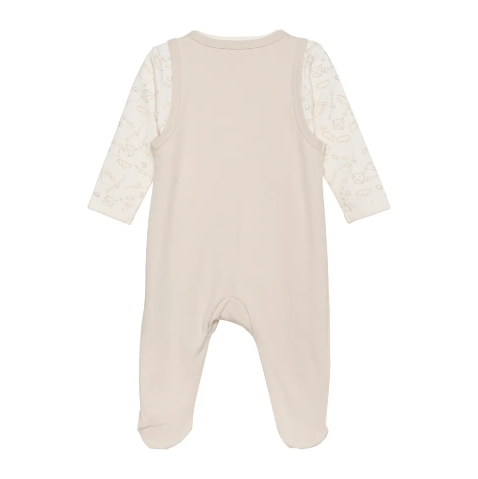 Sæt, som består af en langærmet body med all-over-print og trykknaplukning mellem ben og på skulderen – og smækbukser med påsyede fødder og slå om-effekt med trykknaplukning. Bukserne har print fortil. Certificeret i hht. STANDARD 100 by OEKO-TEX® cert. nr. SH020 156011 TESTEX, tiltro til tekstiler