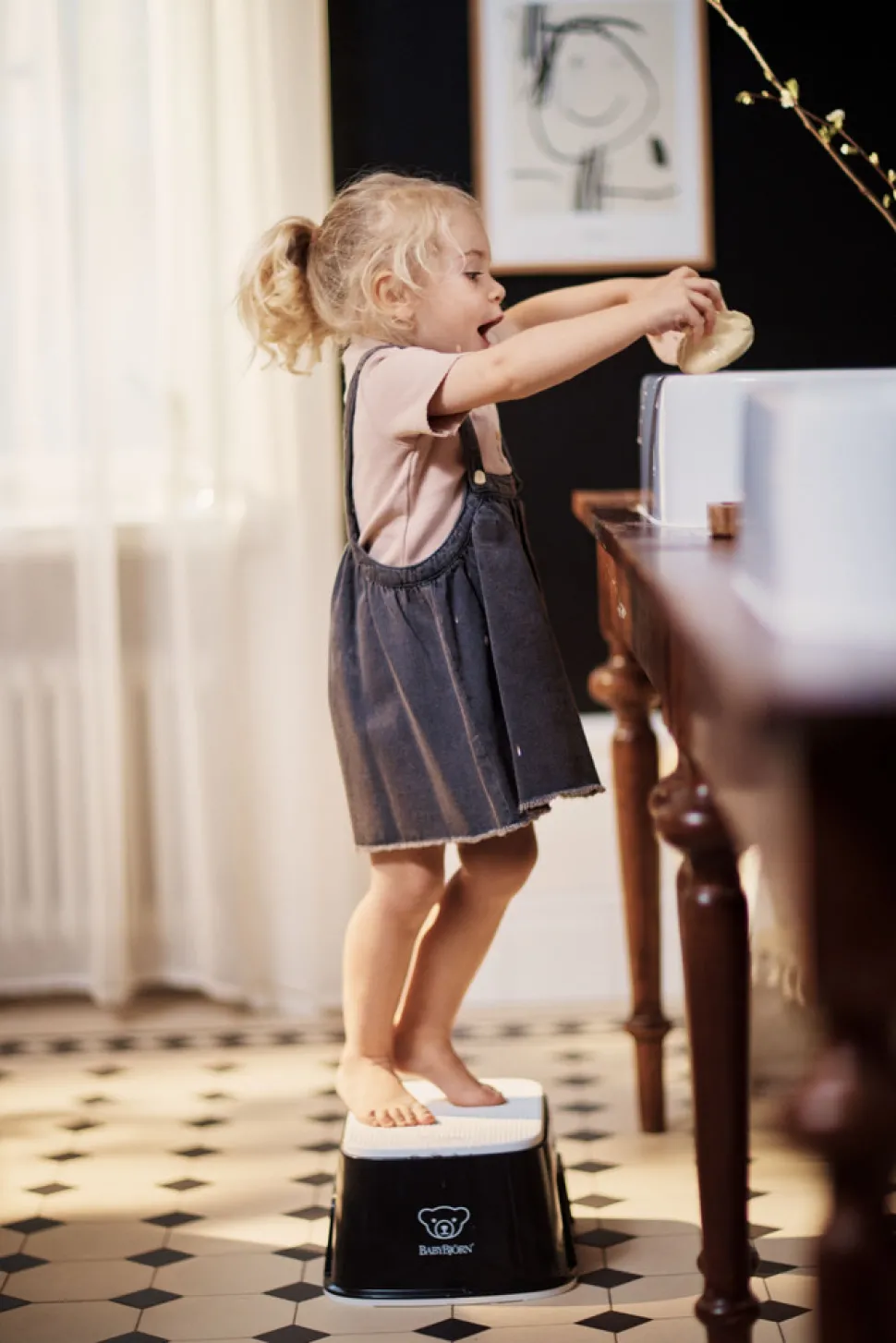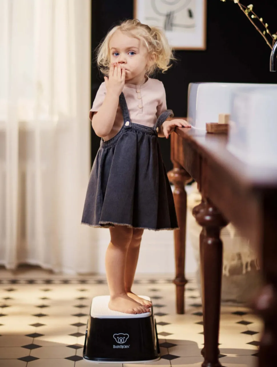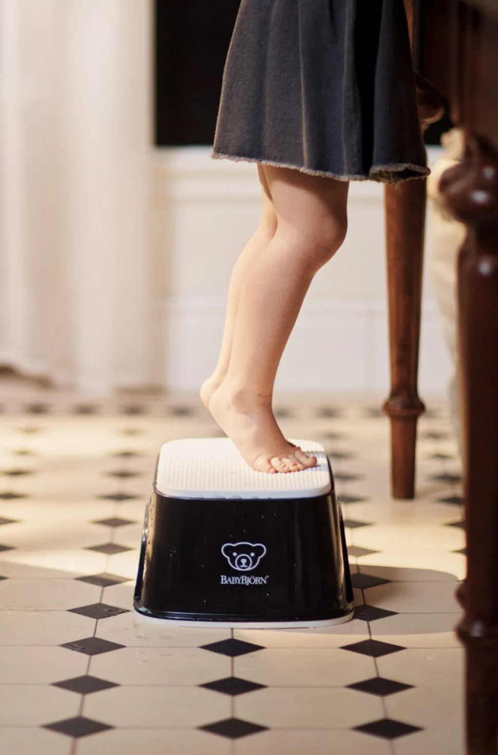 BABYBJÖRN børnetaburet gør det nemt for dit barn at nå toilettet eller badeværelse vasken alene. Skammelen har en skridsikker gummioverflade, der giver et godt greb, selvom dit barn har våde fødder. Taburettens smarte design og premium-materiale giver den en lang levetid med mange anvendelsesområder for både børn og voksne.