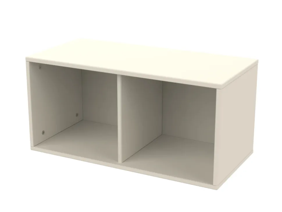 Med ROOMIE-bogkassen kan dit barns bøger, legetøj og tøj opbevares frit og tilgængeligt. Denne bogkasse med to rum kan monteres på væggen både lodret og vandret. Når alt er organiseret, er det tid til leg og sjov!
