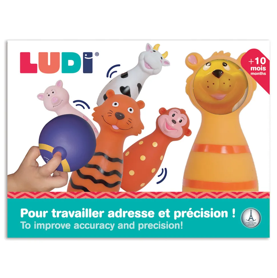 Farverigt bowlingsæt med dyre-kegler. Dette bowlingsæt har et sjovt, børnevenligt design og giver masser af sjov leg. Barnet får styrket deres motorik og koordination samtidig med, at de har det sjovt. Sættet består af 5 kegler og en 1 bold. Barnet kan spille alene eller sammen med andre.