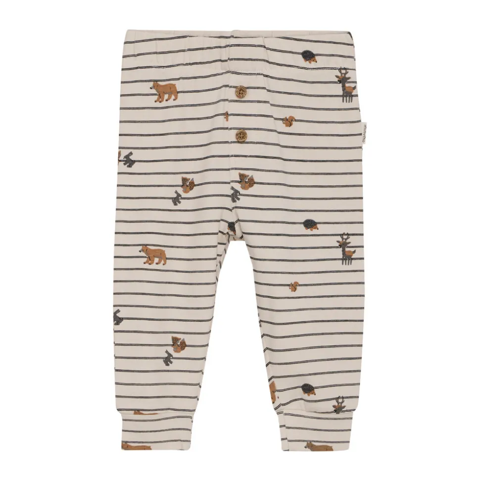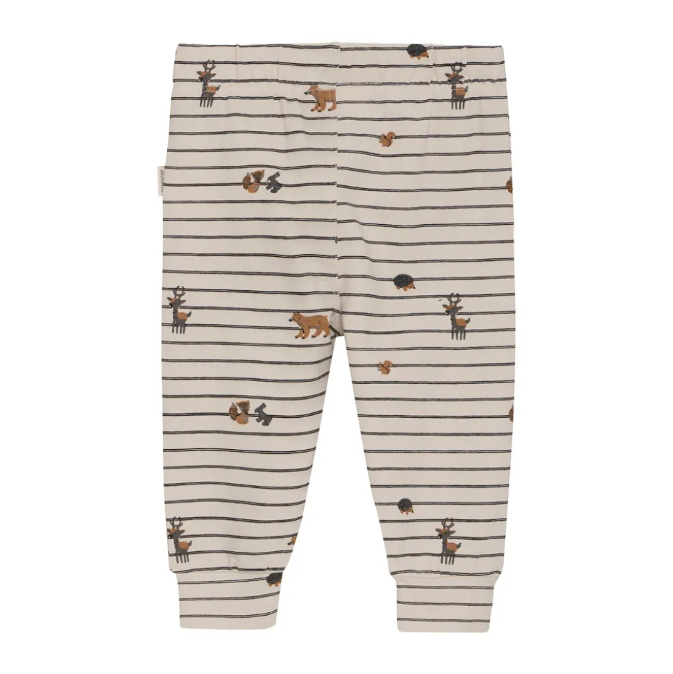 Bukser med striber og sødt dyremotiv fra Minymo. Disse bukser har et legende design med striber og et charmerende dyremotiv foran. De er udstyret med elastik i taljen for en behagelig pasform og har en dekorativ snydegylp med knapper, der fuldender det fine udtryk.