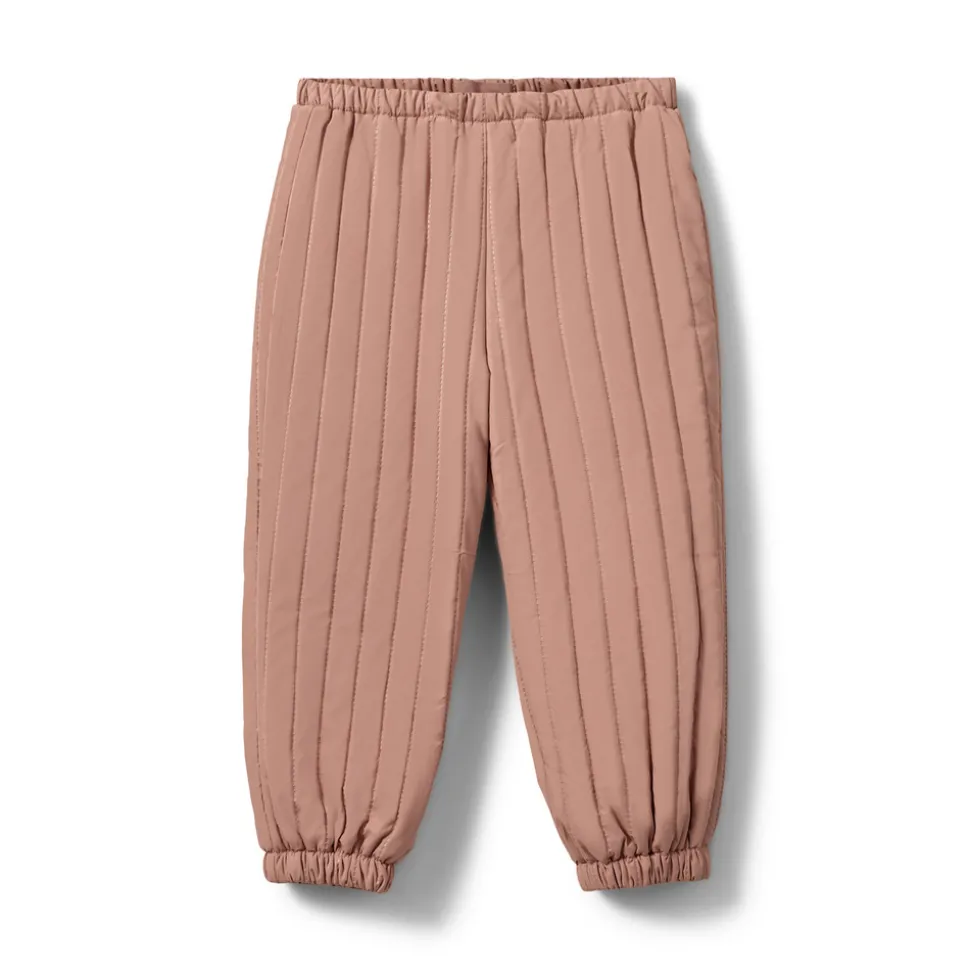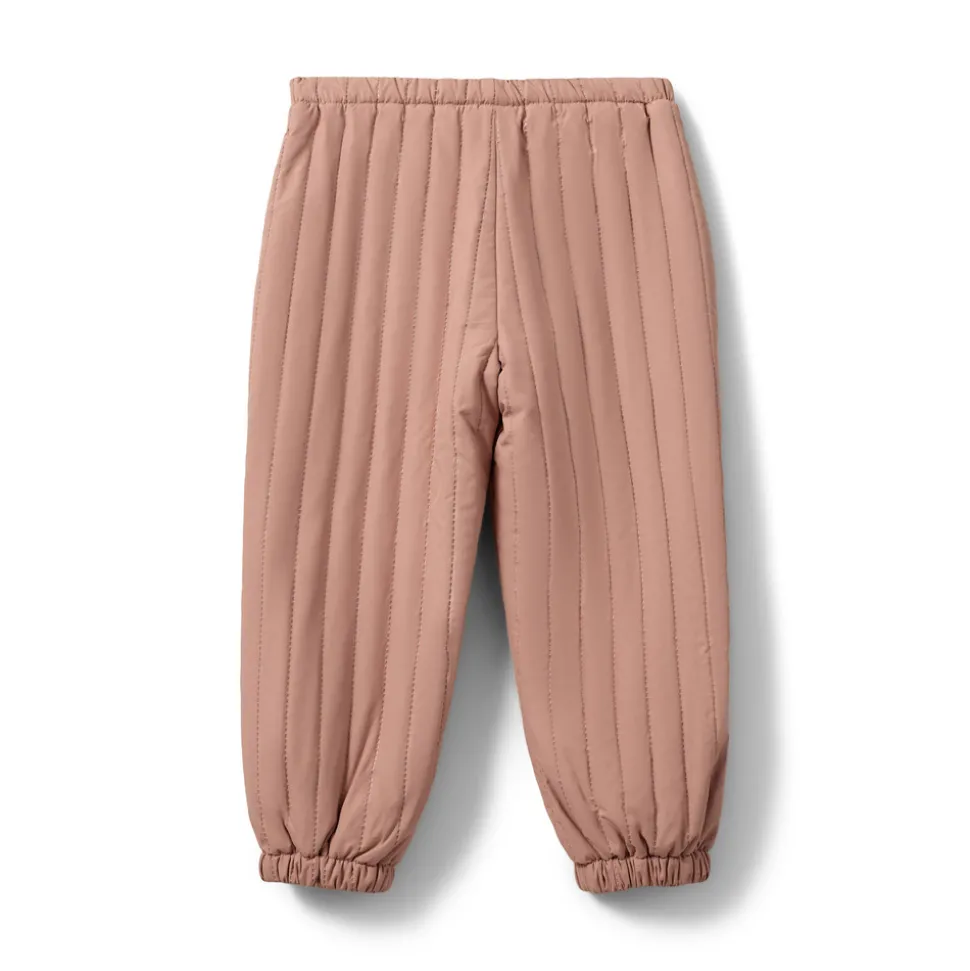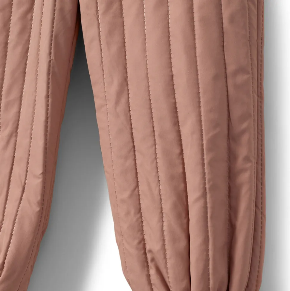 Bukser i rosy brown med synlige syninger og elastik i taljen og benene.