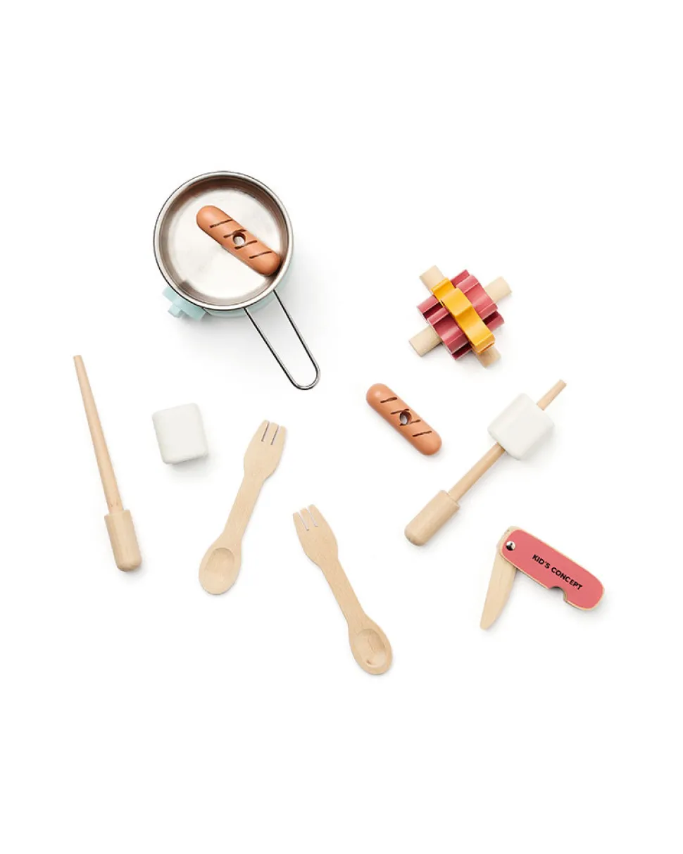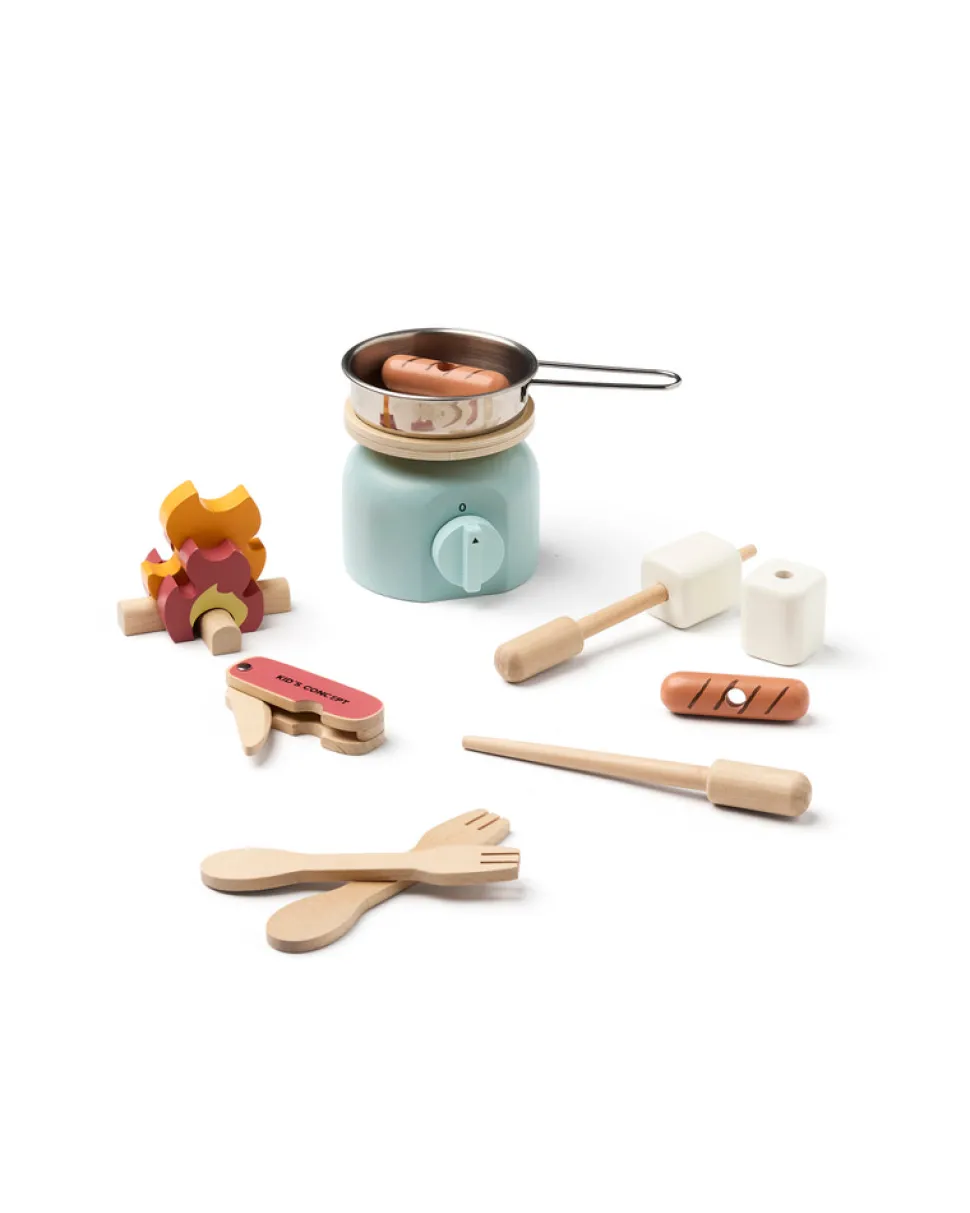 Campingkøkkenet indeholder et gaskomfur, en stegepande, en brændeovn med tre brændeflammer, to grillpinde, to skumfiduser, to pølser og to sporks (en kombination af ske og gaffel) og en kniv. Med dette sæt kan børn opmuntres til at lave mad og servere deres egne campingmåltider.