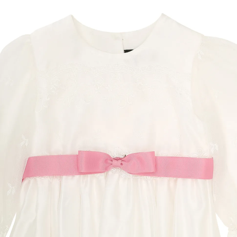 Dåbssløjfe i riflet satin som bindes på ryggen. Den forknyttet sløjfe fæstnes foran i taljen med medfølgende sikkerhedsnål. Bredde 3 cm.