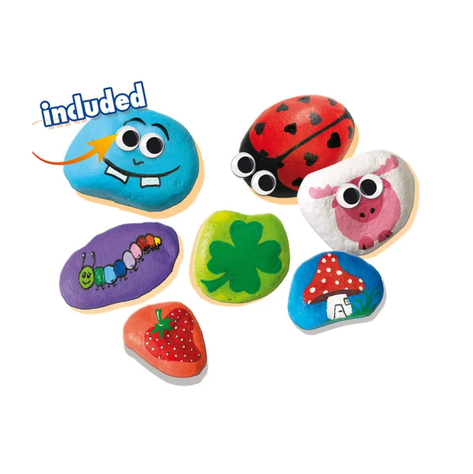 Dette kreative sæt indeholder alle materialer til at male en sten og dekorere den. Lav forskellige varianter med de 6 grundfarver og påfør de sjove øjne, og giv stenen en identitet.