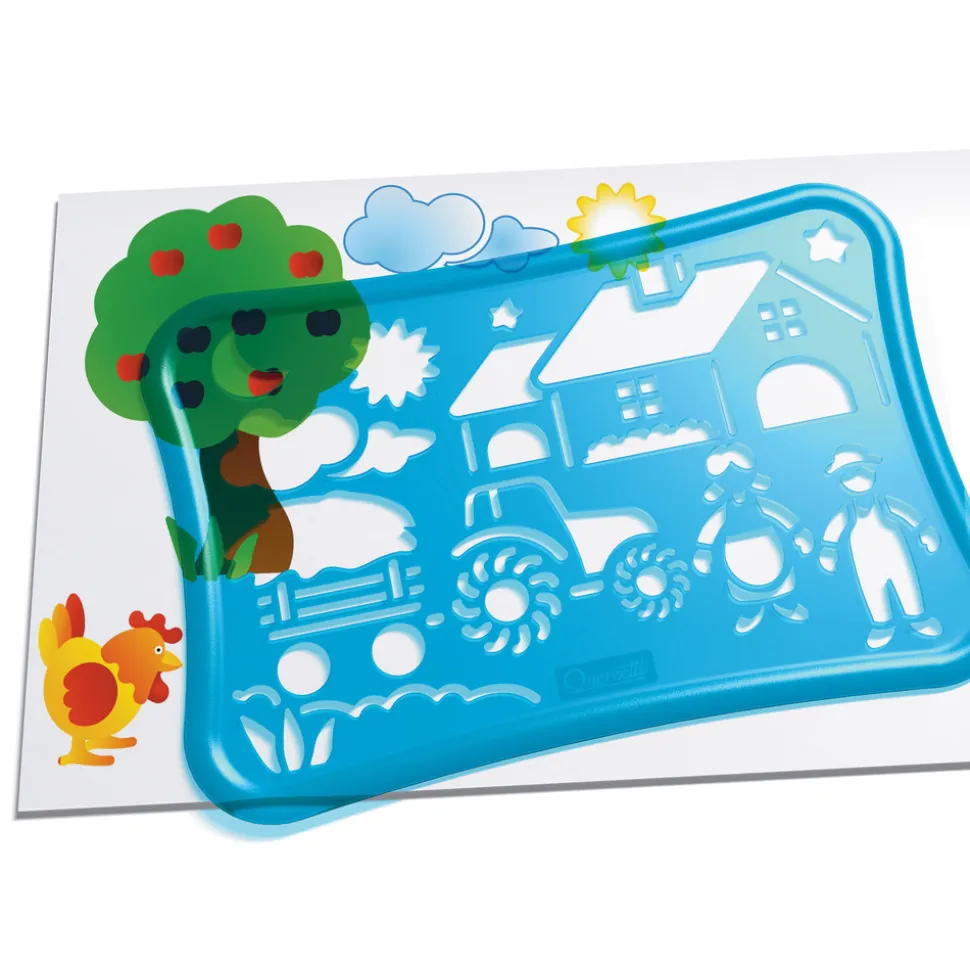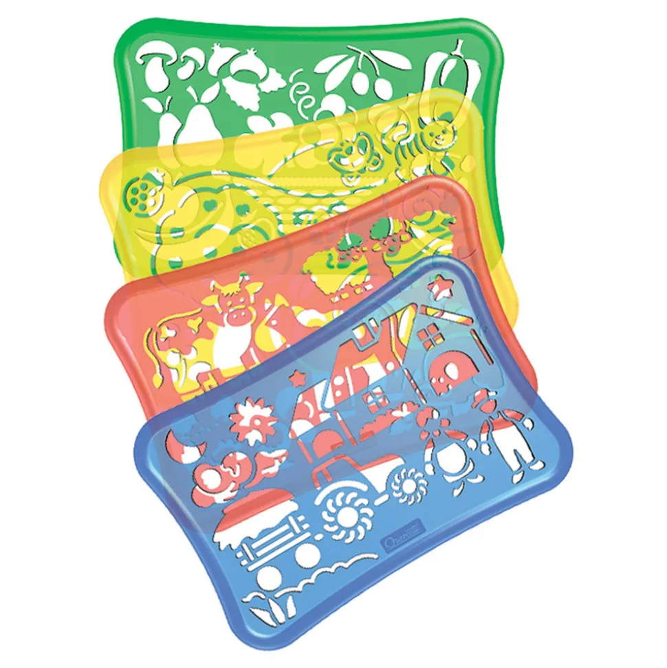 Med disse gennemsigtige skabeloner kan du lave flotte og præcise geometriske tegninger af din drømme-bondegård. Fire forskellige skabeloner med mange motiver hjælper dig med at skabe fine tegninger, som du kan farvelægge med de medfølgende tusser!