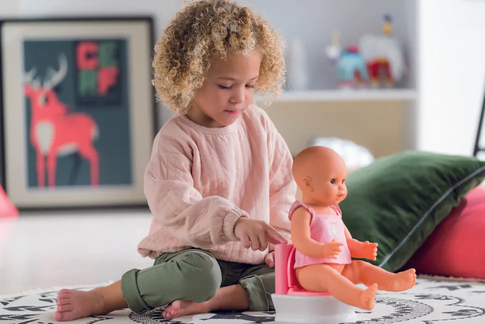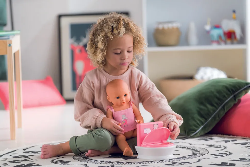 Når det er tid til at lære at bruge toilettet, er dette interaktive toilet det perfekte redskab. Det er designet til at gøre toilettræning sjov og engagerende for dit barn. Låget kan åbnes og lukkes, hvilket giver en realistisk oplevelse. Skylleknappen aktiverer to forskellige lyde – lyden af dukken, der tisser, og lyden af skyllevandet, hvilket gør legen endnu mere autentisk og underholdende.