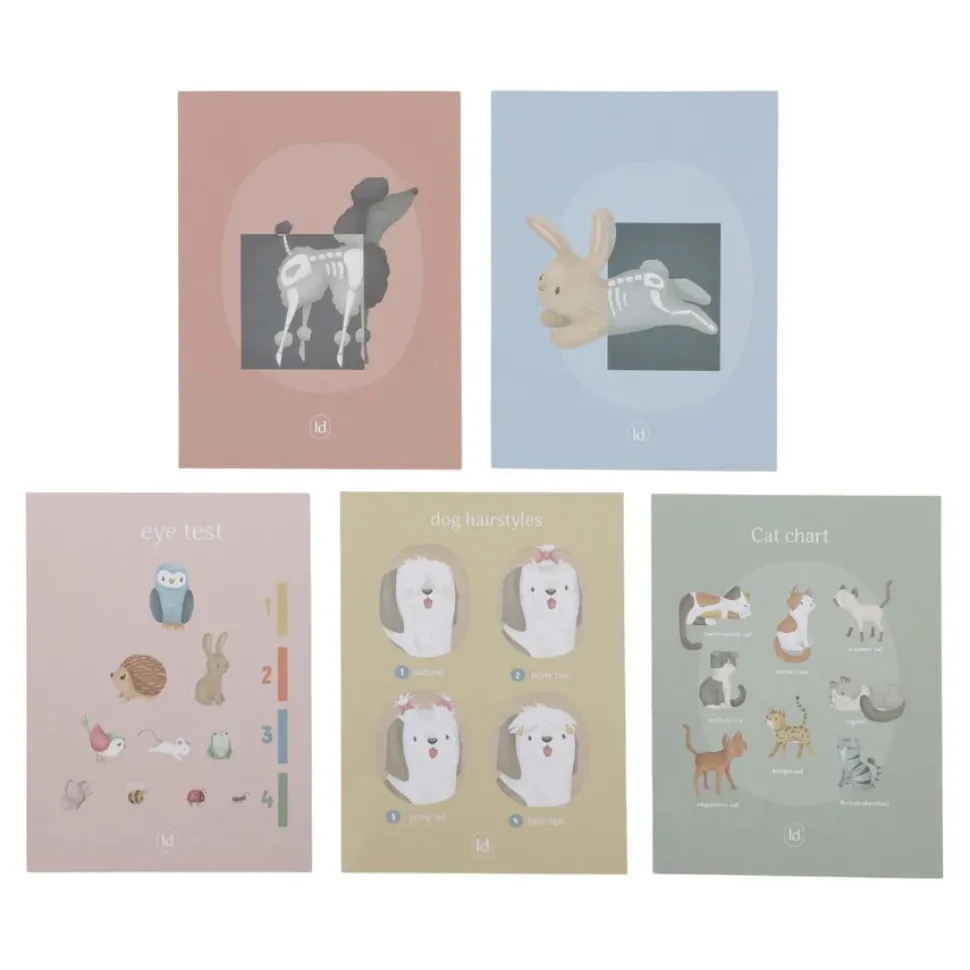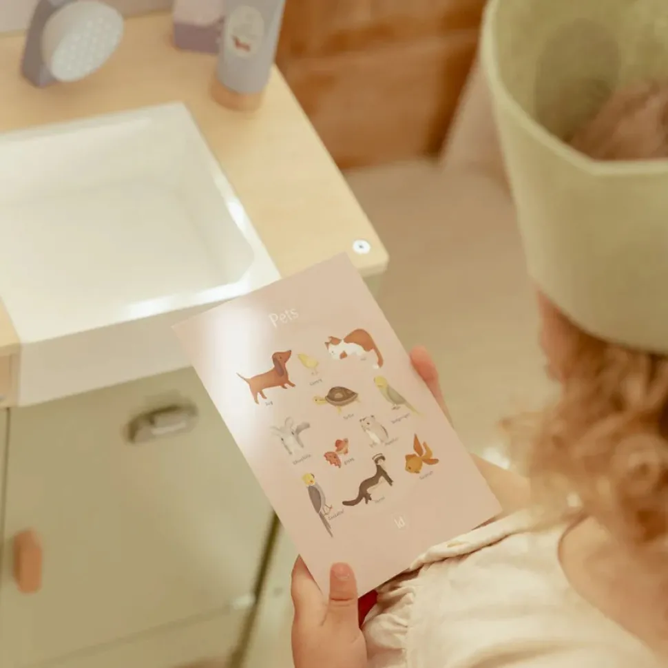 Passer du godt på syge legetøjskæledyr? Med denne omfattende dyrlægeklinik i træ kan barnet leve sig helt ind i rollen som en rigtig dyrlæge. Sættet indeholder alt, hvad der er nødvendigt for at pleje kæledyr, f.eks. et udtrækkeligt brusehoved med håndvask, en kam, et termometer, en sprøjte og bandager. Der medfølger også et pandebånd af stof og en særlig klips til at vise medicinske illustrationer og røntgenbilleder. Tid til den næste patient!