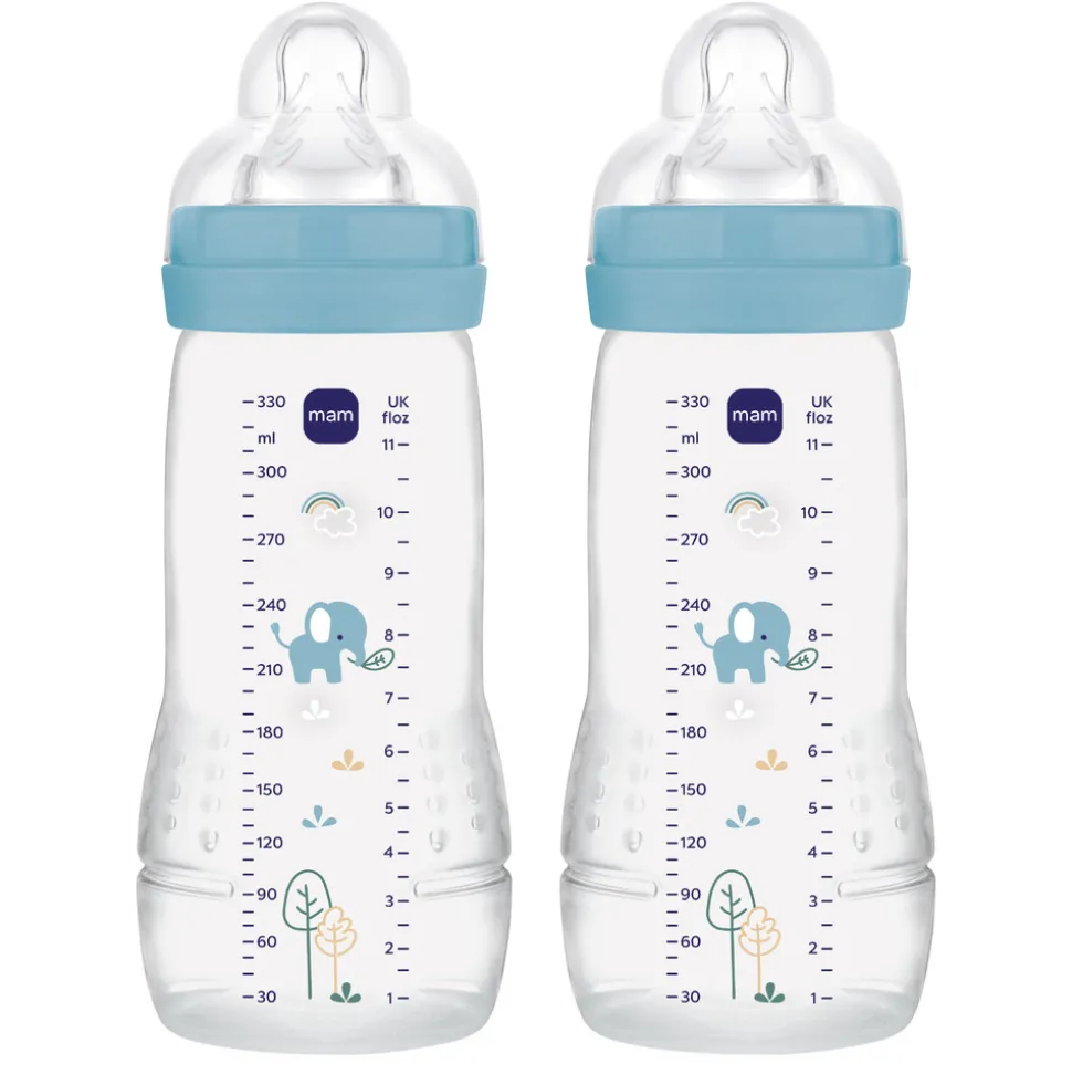 MAM Easy Active Baby Bottle 330ml 2pk Blue er det perfekte valg til både baby og forældre, der ønsker en praktisk og komfortabel flaske. Flaskerne har et ergonomisk design, som gør dem nemme at holde for både små og store hænder. Den bløde silikone sut giver en naturlig følelse, der minder om mors bryst, og den indbyggede anti-kolik ventil sikrer et jævnt flow og mindsker risikoen for luft i maven. Med en kapacitet på 330 ml er flaskerne ideelle til både mælk og vand, og de fine blå detaljer gør dem ekstra søde. Sættet indeholder to flasker, så du altid har en ekstra ved hånden.Specifikationer: