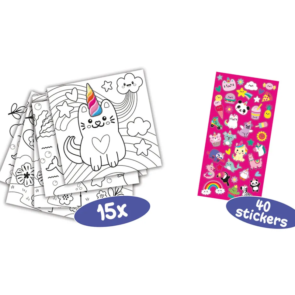15 sider, der kan farvelægges, med sjove Uni-dyr. Det oppustede skumhorn kan ses igennem alle sider. En helt enestående malebog! Der er 40 ekstra blanke klistermærker, som du kan dekorere dine tegninger med.