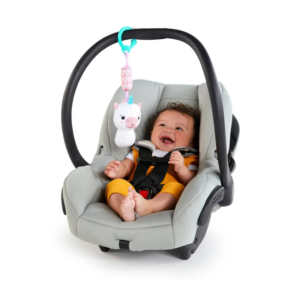 Sødeste enhjørninge-rangle. Produktet er med til at udvikle babyens finmotoriske evner og kan monteres i autostolen, i barnevognen, på bilsædet mm. Nem at tage med på farten.