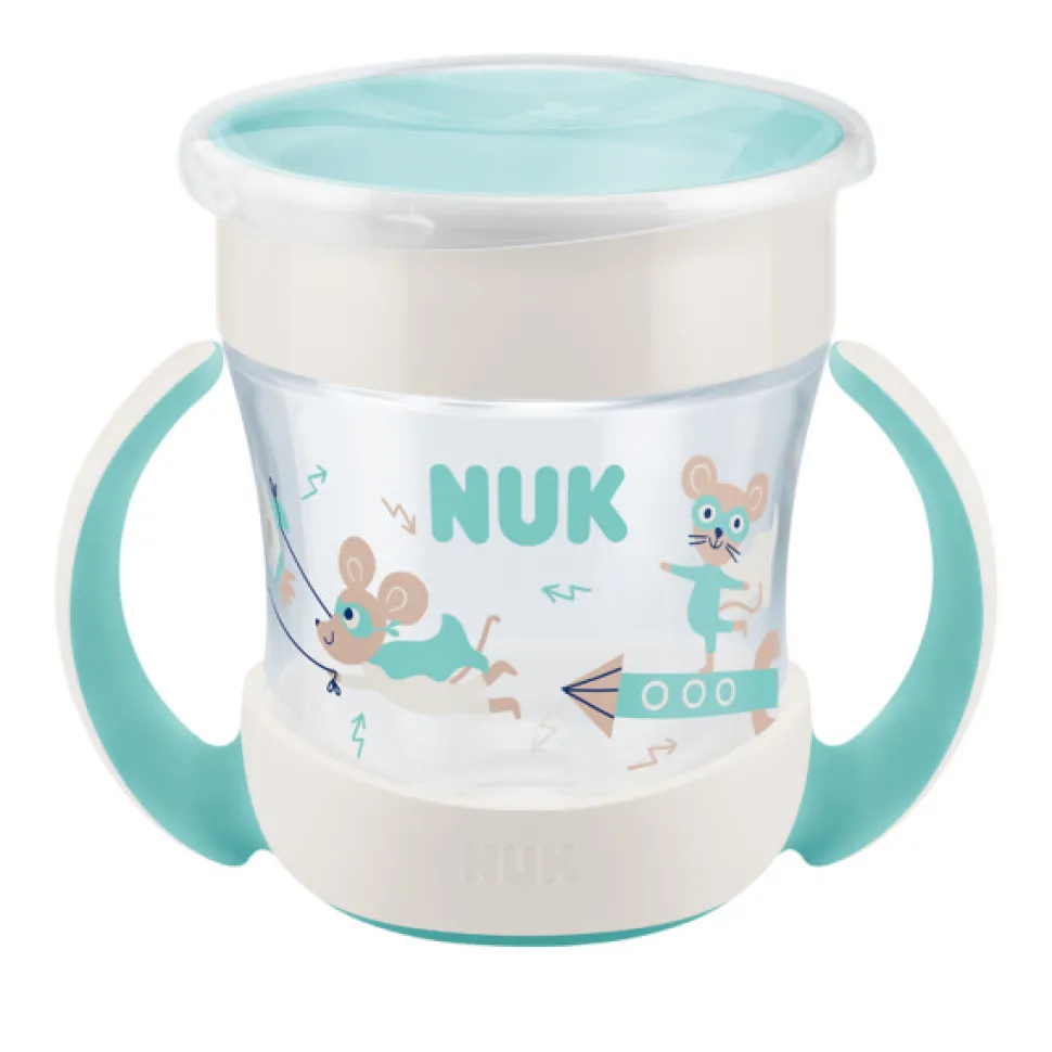 NUK Mini Magic Cup har et innovativt design, der gør at barnet kan drikke af den fra alle sider. Præcis som af et almindeligt glas, uden at spilde. De ergonomiske håndtag er udviklet for at passe barnets små hænder.
