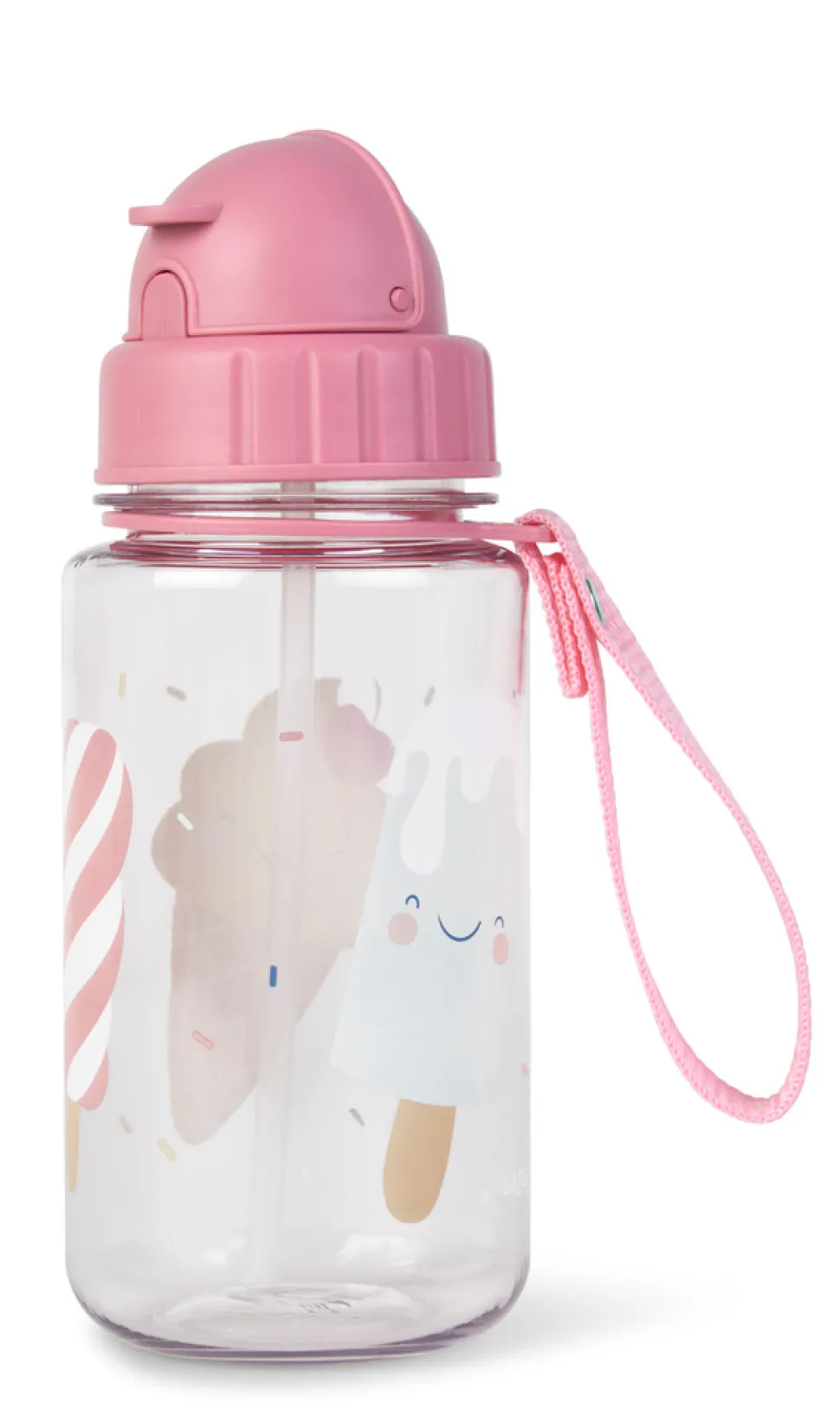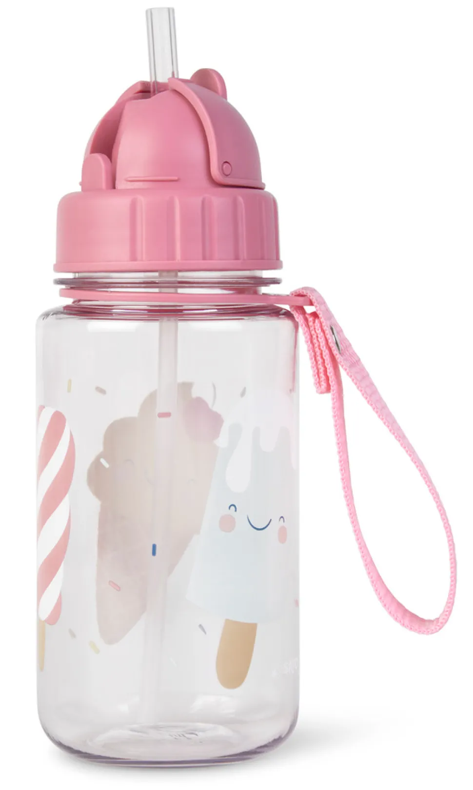 Denne praktiske flaske med flip-top silikone sugerør er perfekt til at have med i børnehave, vuggesture og skole. Sugerøret kommer automatisk ud, når låget åbnes, hvilket forhindrer vandspild. Den har også et håndtag, der gør, at den bl.a. kan bæres i rygsækken.