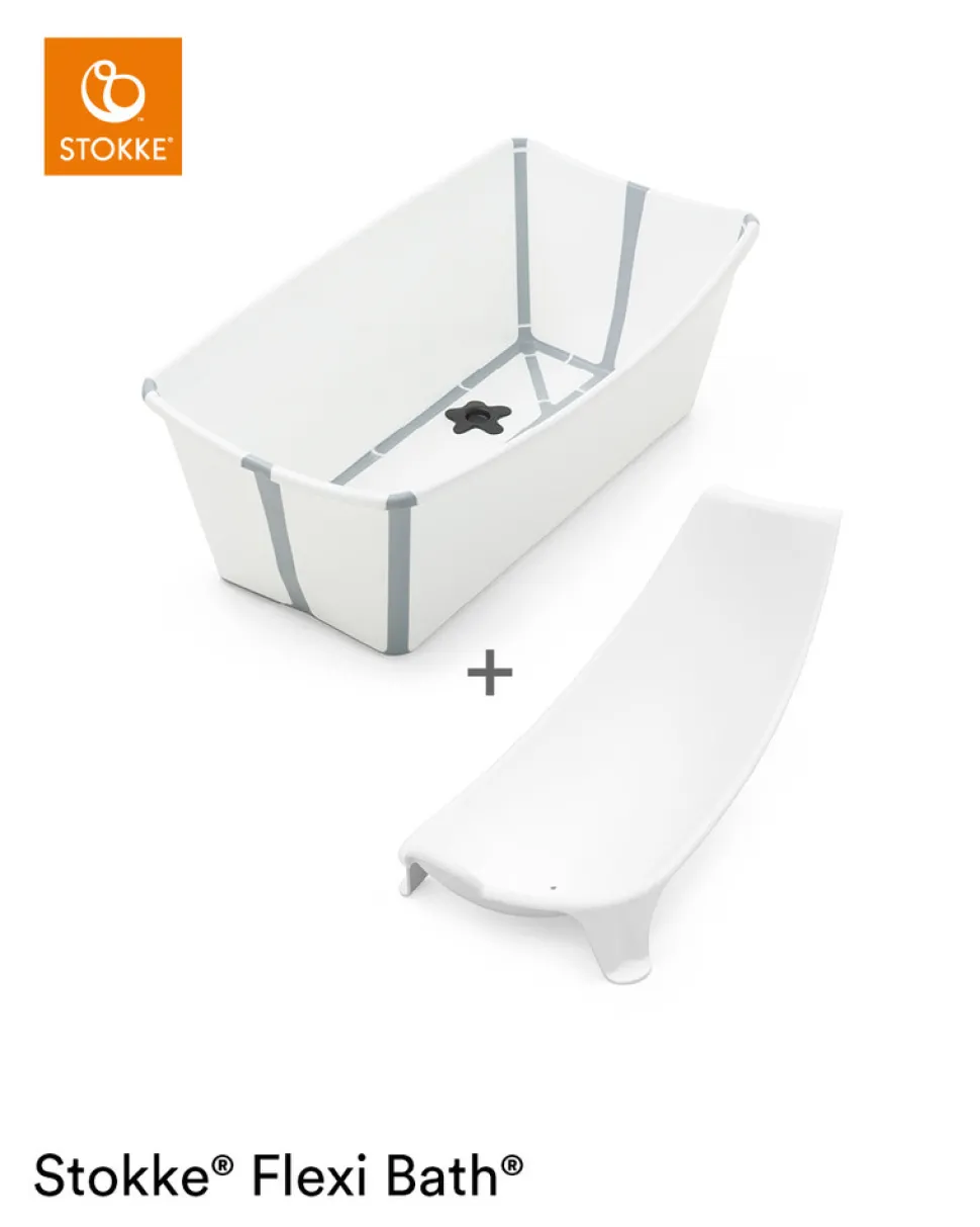 Med Stokke® Flexi Bath™ kan det kun blive et godt bad for barnet, og samtidig er det så praktisk at det kan bruges både hjemme og ude – på ferie, i haven ja lige hvor man ønsker det. Stokke® Flexi Bath™ er et prisbelønnet badekar og det er der god grund til. Stokke® Flexi Bath™ er ikke kun et flot design badekar men bestemt også praktisk – det kan nemlig foldes – foldes ja den er god nok. Lige meget om man har et stort eller lille badeværelse så må det siges at det er praktisk lige at kunne folde sit badekar sammen og derved spare lidt på pladsen, også er det jo lige til at tage med sig. Bunden i badekarret er skridsikkert og den fine prop har varmesensor. Det vil sige at proppen skifter farve og giver således en synlig besked om at vandet er ved at blive varmt og lige skal tjekkes, det er nemlig vigtig du ikke tænker proppen som et badetermometer men som en hjælp så husk altid at tjekke vandtemperaturen en ekstra gang. Stokke® Flexi Bath™ badekarret er fremstillet af materialer der er fri for tungmetaller, ftalater, formaldehyd, BPA og andre skadelige stoffer. Det er blandt andet fremstillet af polypropylen (PP) og termoplastisk elastomer (TPE). PP er et fast materiale, som stabilitet. TPE er et blødt, elastisk materiale, der anvendes i hjørnerne og i gulvet og sikrer, at badet kan foldes – igen og igen. Det anbefales at tørre badekarret at indvendigt inden det foldes sammen. Her er badekaret kombineret med Newborn Support så du meget nemmere kan bade den lille nyfødte.