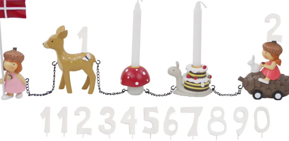 Fødselsdagstog m. 11 tal i det fineste Skovalfer tema. Håndmalet, så ingen er ens. Plads til to talnumre i toget. Inkl. flag. Mål: 17x45x6 cm.