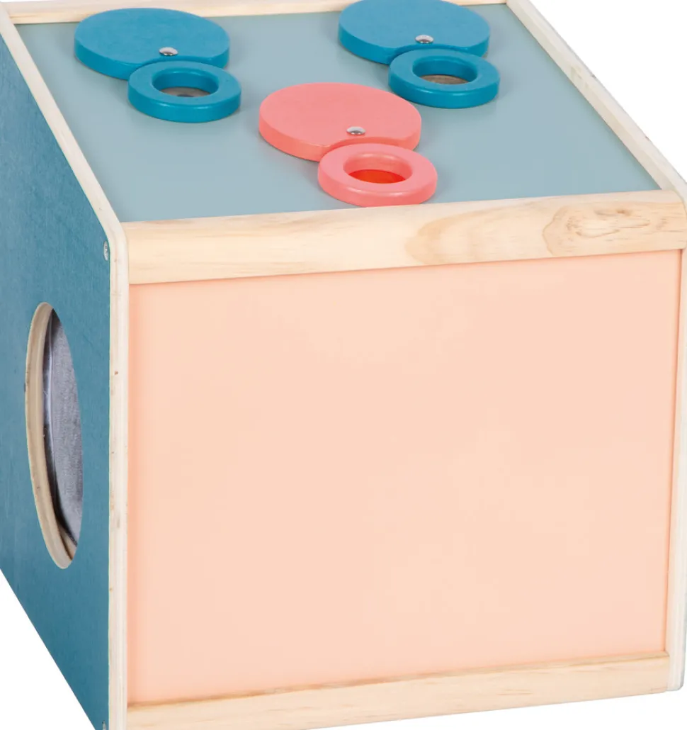 Skærp dine sanser på en sjov måde! Denne generøse sensoriske fældningskasse fra “Sensory” produktlinjen har to åbninger på siden og giver masser af muligheder for at udforske genstande ved hjælp af berøring, syn, lugt og hørelse. Et forstørrelsesglas, en kalejdoskoplinse og en rød linse giver dig mulighed for at se genstande inde i kassen på en ny måde. Den skrå overside af æsken gør det nemt at se igennem og røre ved genstande. De tre linser indkapslet i træ kan nemt fjernes, så åbningerne i toppen af æsken kan bruges til at se, lugte og lytte. Mængden af lys, der tillades ind i kassen, kan styres via åbningsvinklen på bagdøren og den øverste sommerfugleåbning. Genstande kan placeres i denne trækasse gennem bagdøren med en magnetisk lås. Ærmer lavet af stof på sideåbningerne blokerer udsynet ind i kassen. Takket være deres elastiske stof kan ærmerne bruges af både børn og forældre. Det er et taktilt, visuelt og lugtende sansespil, der tilbyder gættesjov for enten én eller op til ni spillere. Ærmebåndene er fastgjort via krog-og-løkkestykker, hvilket gør dem aftagelige, så de kan vaskes i hånden.