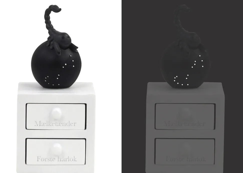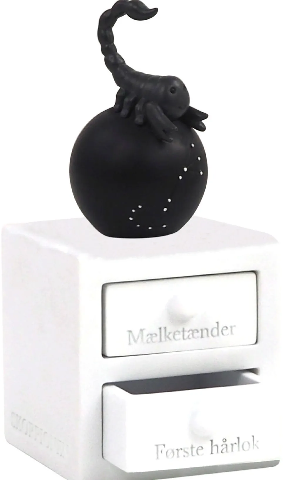 Første tand og hårlok æske med skorpionen stjernetegn, med planet og stjernebillede, som lyser i mørket. Figuren har to skuffer – En til første tand og en til hårlok. Super fin dåbsgave ide. Æsken er håndmalet så der kan være variationer.