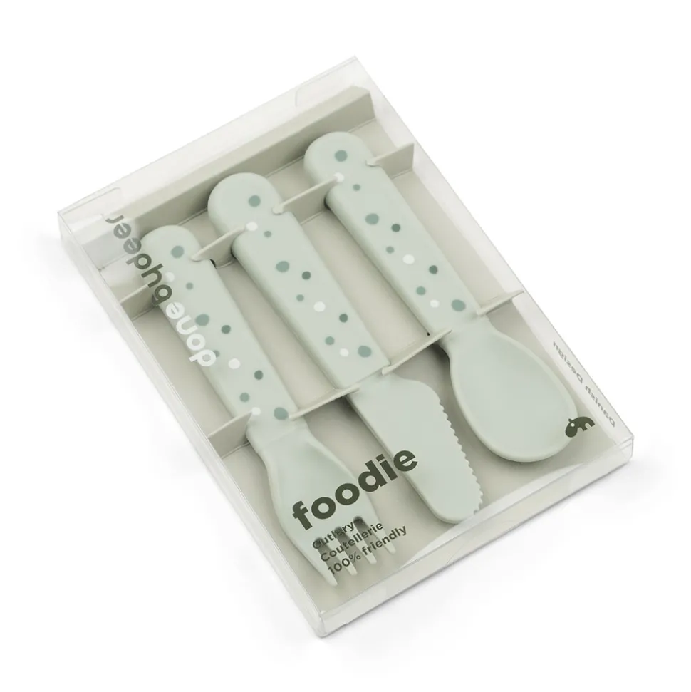 Foodie bestiksættet med Happy dots har afrundede kanter, som gør det sikkert og behageligt for dit barn at øve sig i at spise med bestik. Børnebestiksættet passer perfekt til små hænder og er gennemtestet af børn. Det søde bestiksæt til babyer og tumlinger består af en ske, en gaffel en og kniv. Efter utallige familiemiddage og børnefester kan bestikket affaldssorteres som plast og genanvendes til fremstilling af nye hverdagsprodukter. Bestikket har en mat, silkeblød overflade og matcher resten af Foodie kollektionen.