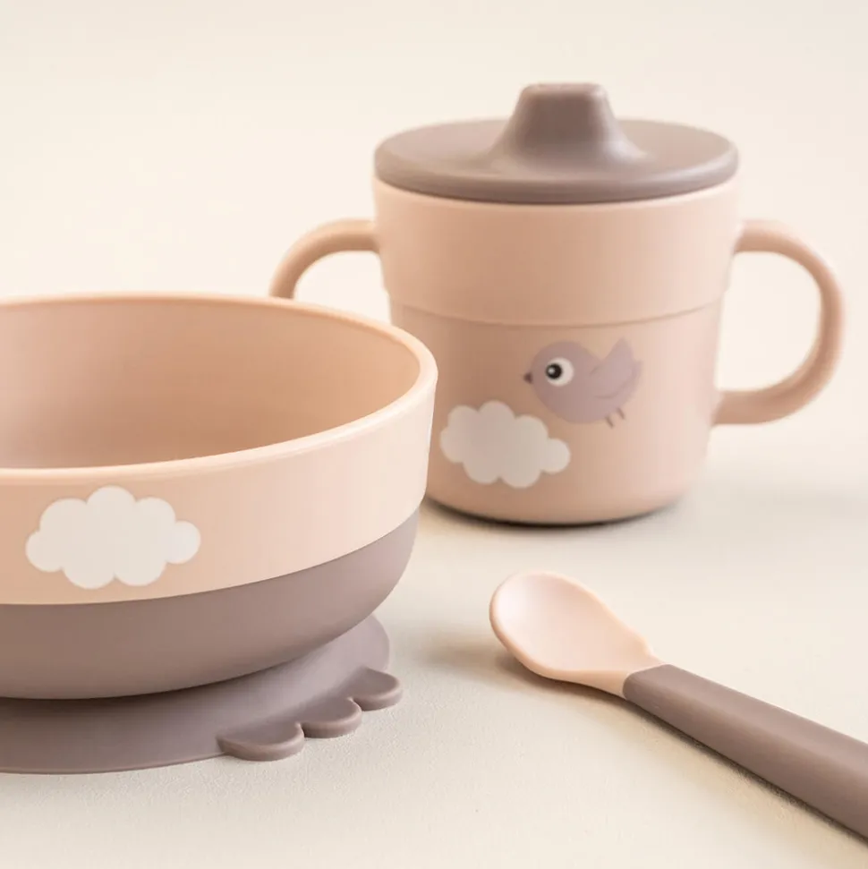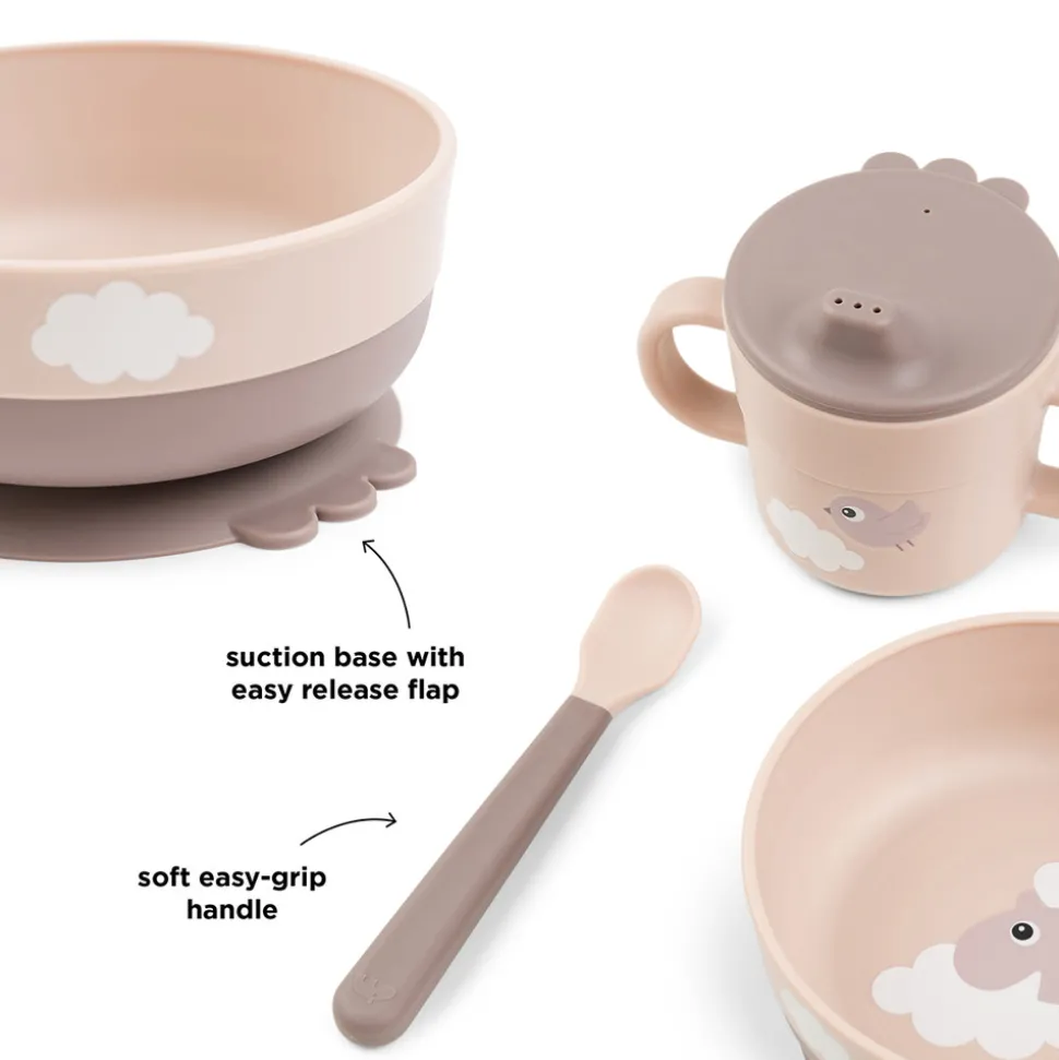 Små børn vil elske at få serveret et måltid i dette fine Foodie første spisesæt med et legende motiv. Den praktiske, skridsikre bund sørger for, at skålen bliver, hvor den skal, og skeens easy grip-belægning giver et godt greb mens babyen mades.
