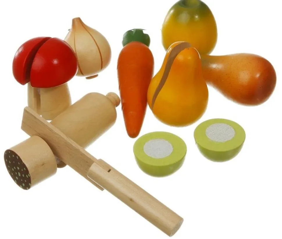 Pølse, frugt og grønt i træ m. velcro, så det kan skæres over og samles igen og igen, hvilket er super træning af finmotorikken. Høj kvalitet og helt fri for skadelige stoffer og naturligvis malet med giftfri maling