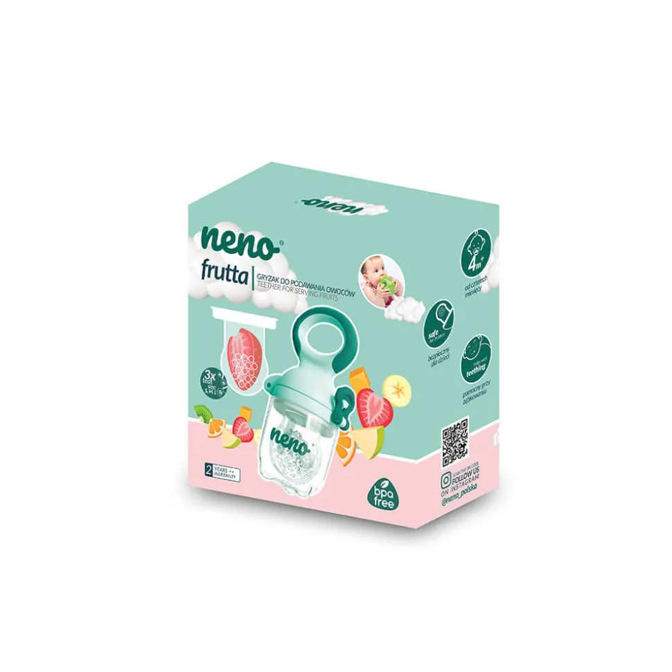 Neno Frutta er en bider med netbeholder, hvor frugt og grøntsager trygt kan gives til dit barn. Frugtsut gør det nemmere at lære at tygge mad og eliminerer samtidig risikoen for kvælning. Derudover er den ideel til at udvide barnets kost og giver en sund forsyning af værdifulde vitaminer og mineraler gennem snacks.