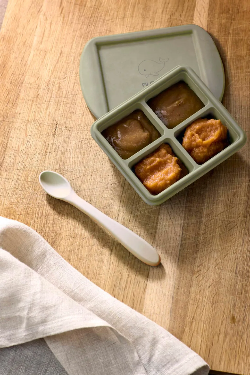 Hver bakke rummer fire rum, der tilsammen kan indeholde 270 ml. De leveres med et tætsluttende låg, der holder maden frisk. Det fleksible materiale gør det nemt at få de frosne portioner ud, mens den holdbare konstruktion gør bakkerne ideelle til daglig brug. Fremstillet af 100% LFGB-certificeret, fødevaregodkendt silikone er bakkerne sikre til fryser, mikroovn og opvaskemaskine (husk at fjerne låget før opvarmning eller vask).