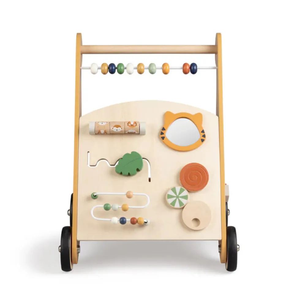 Gåvognen indeholder 8 forskellige aktiviteter. Tæl træperlerne på kuglerammen, spil tre på stribe, eller kig i det babysikre spejl. På den ene side af gåvognen er der en indbygget puttekasse, hvor de medfølgende træfigurer kan placeres gennem de tilpassede huller.