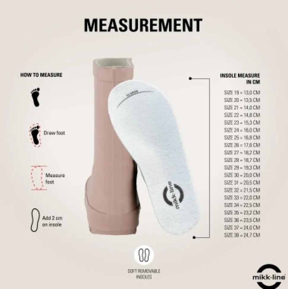 - Indvendigt mål: Størrelse 20: 13,5 cmStørrelse 21: 14,0 cmStørrelse 22: 14,8 cmStørrelse 23: 15,3 cmStørrelse 24: 16,0 cmStørrelse 25: 16,8 cmStørrelse 26: 17,6 cmStørrelse 27: 18,2 cmStørrelse 28: 18,7 cmStørrelse 29: 19,3 cmStørrelse 30: 20,0 cmStørrelse 31: 20,5 cmStørrelse 32: 21,5 cmStørrelse 33: 22,0 cmStørrelse 34: 22,5 cmStørrelse 35: 23,2 cm