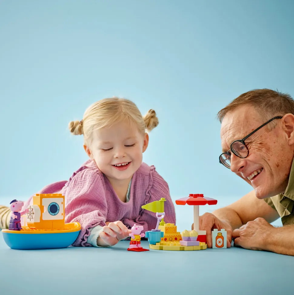 Alle ombord i LEGO® DUPLO® legetøjet Gurli Gris’ bådtur (10432), der rummer timevis af glad læring for de mindste. Piger og drenge fra 2 år kan tage med figurerne af Gurli og Bedstefar Gris til stranden i hans båd. Bygge- og ombygningslegetøjet erfyldt med kreativt tilbehør, der inspirerer små børns historiefortælling. De kan hjælpe Gurli med at smøre solcreme på, gå på jagt efter skaller og finpudse deres stablingsevner ved at bygge et sandslot. Hvis solen er for varm, kan Gurli søge ly under parasollen eller tage en svømmetur, og tumlinger træner deres øje-hånd-koordination og finmotorik, når de hjælper hende med at tage sine svømmefødder på. Hvis de små også gerne selv vil køle af, kan Gurli Gris-legesættet med en båd flyde rigtigt, så de kan nyde timevis af plaskende sjov med vandlegetøjet. LEGO DUPLO Gurli Gris børnelegetøj er designet til at understøtte børnehavebørns læring og hjælpe dem med at tænke logisk og kreativt, når de bygger en historie og udspiller scener fra tv-serien.