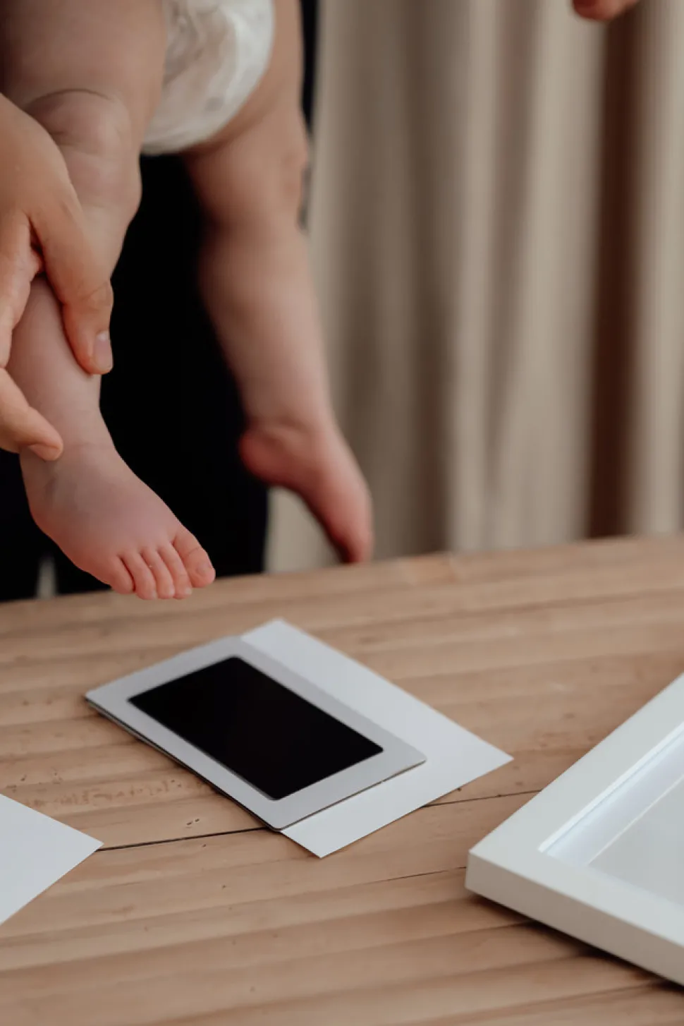 Skab minder, komplet sæt til at lave et aftryk af barnets fod eller hånd derhjemme. Resultatet er et vedvarende og smukt minde, perfekt til dit eget hjem eller som gave.