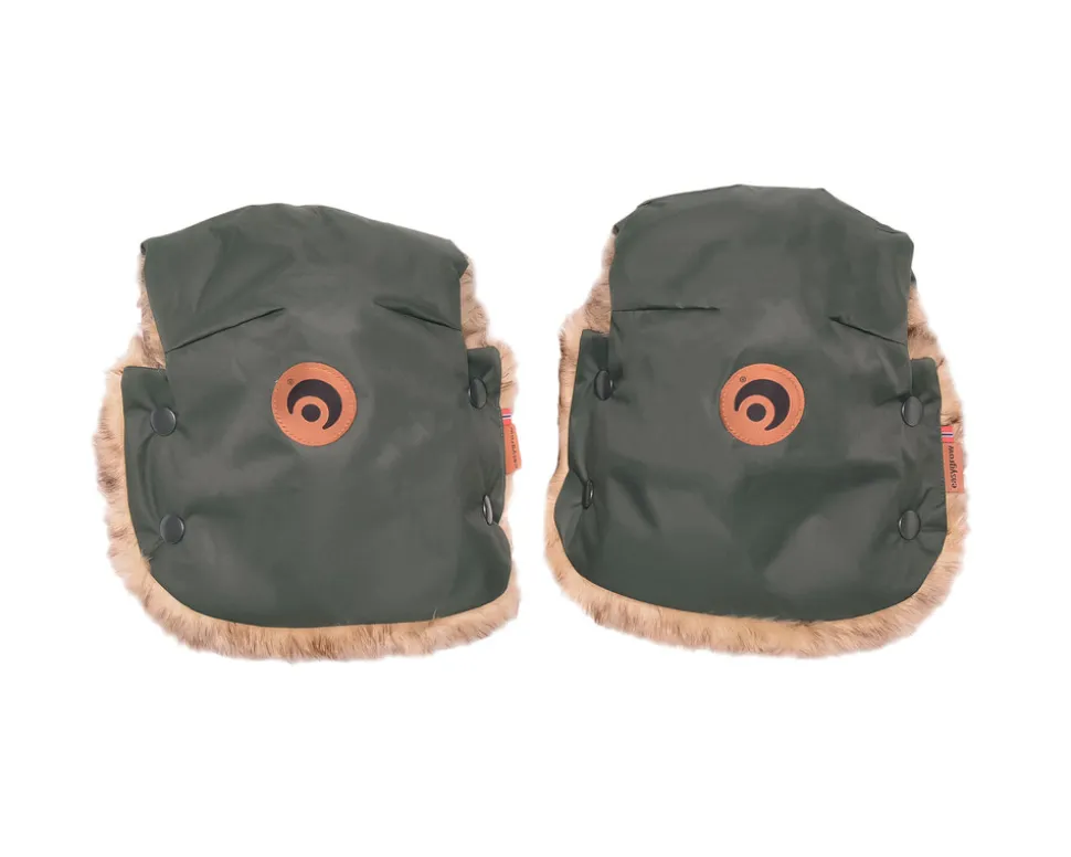 Herlige håndmuffer i samme materiale som køreposerne i vand- og vindtæt polyester, foret med kunstpels. Kan fastgøres til håndtaget på barnevognen, og holder dig varm på turen. Håndmufferne kan kobles sammen, så de kan bruges enkeltvis eller sammensat.