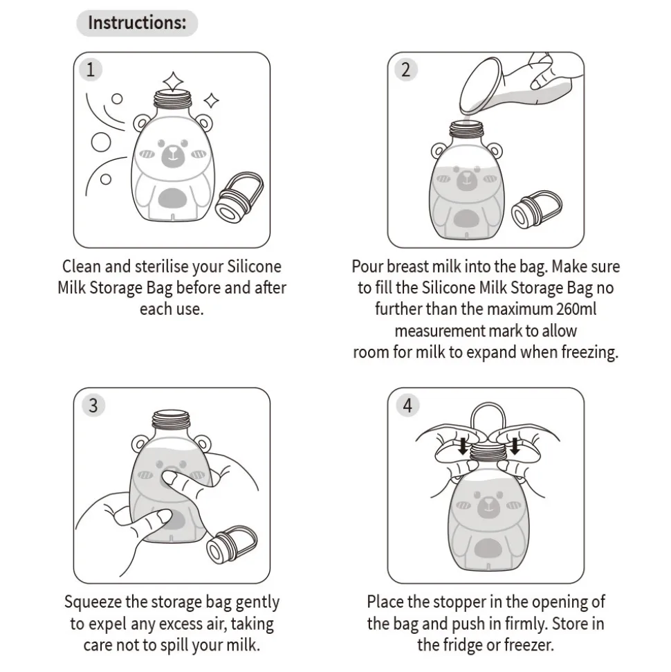 Praktiske og nuttede genanvendelige silikone poser til brystmælk, puréer eller smoothies. Egent til køleskab og fryse og selvfølgelig lavet af 100% fødevaregodkendt silikone.