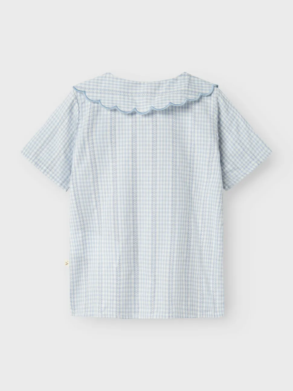 Giv din piges garderobe et friskt pust med denne charmerende ternede skjorte med sød flæsekrave. Skjorten er perfekt til både hverdag og særlige lejligheder, og den kombinerer klassisk ternet mønster med en moderne flæsekrave for et unikt look.
