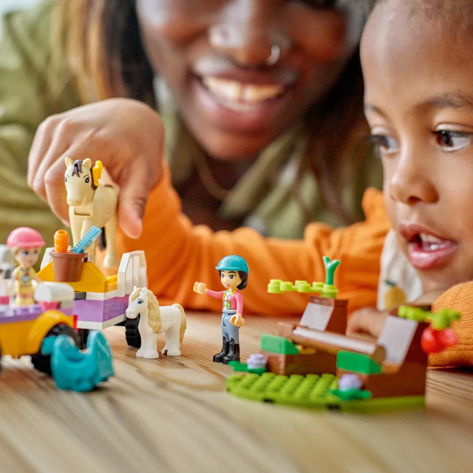 Liann og Zoya skal på ridetur. Først læsser de hesten og ponyen på trailer 42634 og kører så ud til skoven. Når de ankommer, strigler de hestene og gør dem klar til at ride. De finder et væltet træ, der kan fungere som en forhindring, som hesten og ponyen kan hoppe over. Efter en sjov dag belønner vennerne hestene med en lækker gulerod.