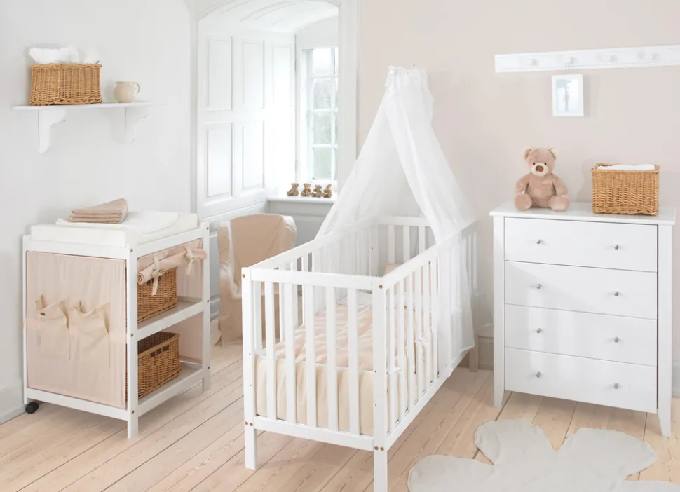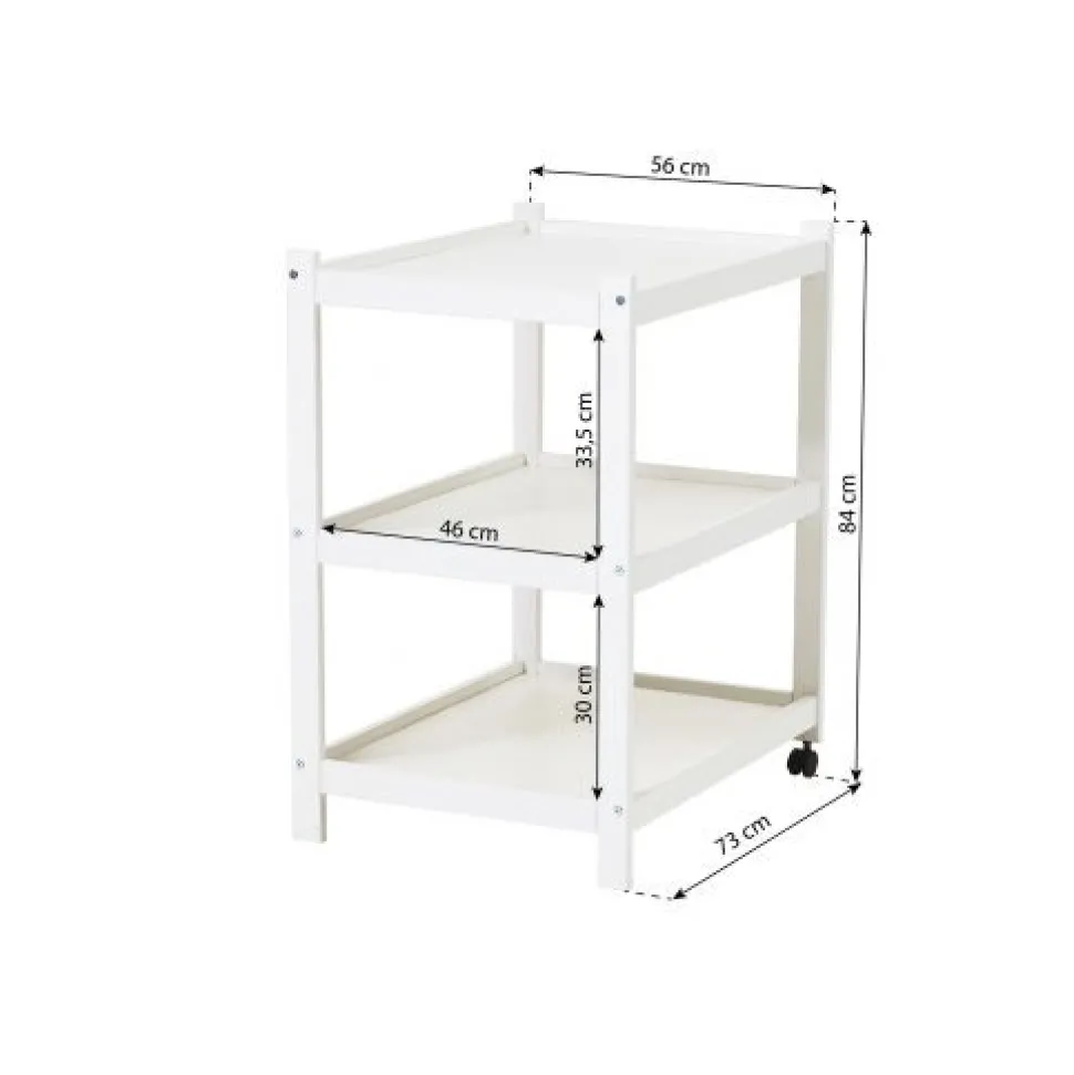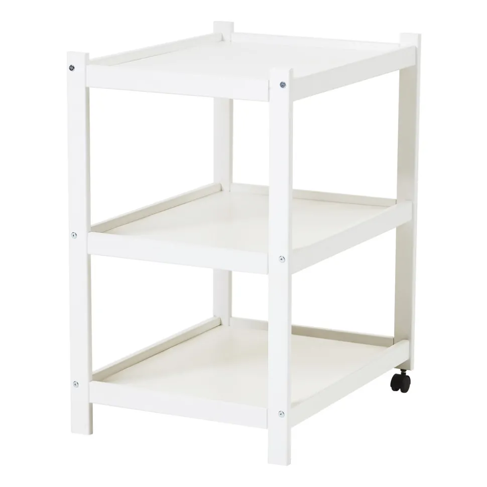 Smart puslereol fra Hoppekids. Enkelt og stabil, men samtidig let at flytte rundt pga. de to hjul. Reolen er overfladebehandlet med miljøvenlig, vandbaseret lak, uden skadelige og unødige kemikalier. Ida-Marie puslereol fra Hoppekids er en sød og enkel puslereol. Den lille størrelse på reolen gør, at den passer ind mange steder og især på små badeværelser. De to hjul gør det nemt at flytte med reolen, samtidig med at stabiliteten bevares. Ida-Marie er udstyret med to store, praktiske hylder. Det giver masser af plads til de ting, som du har brug for at have lige ved hånden, når du pusler. Hvis du tilkøber tekstil til puslereolen får du endnu mere plads, fordi tekstilet har praktiske lommer i siden.