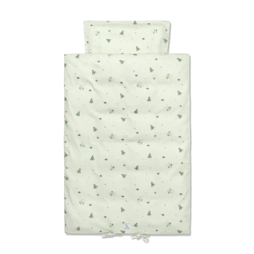 Junior: 100×140 cm | 40×45 cm.100% økologisk bomuld.Betræk dyne: Snorebinding / Betræk pude: Kuvertlukning.Maskinvaskes på 60° CSengesættet fra Vanilla Copenhagen er vævet i det fineste økologiske bomuld. Miljøvenlig og helt fri for allergener og skadelige stoffer.
