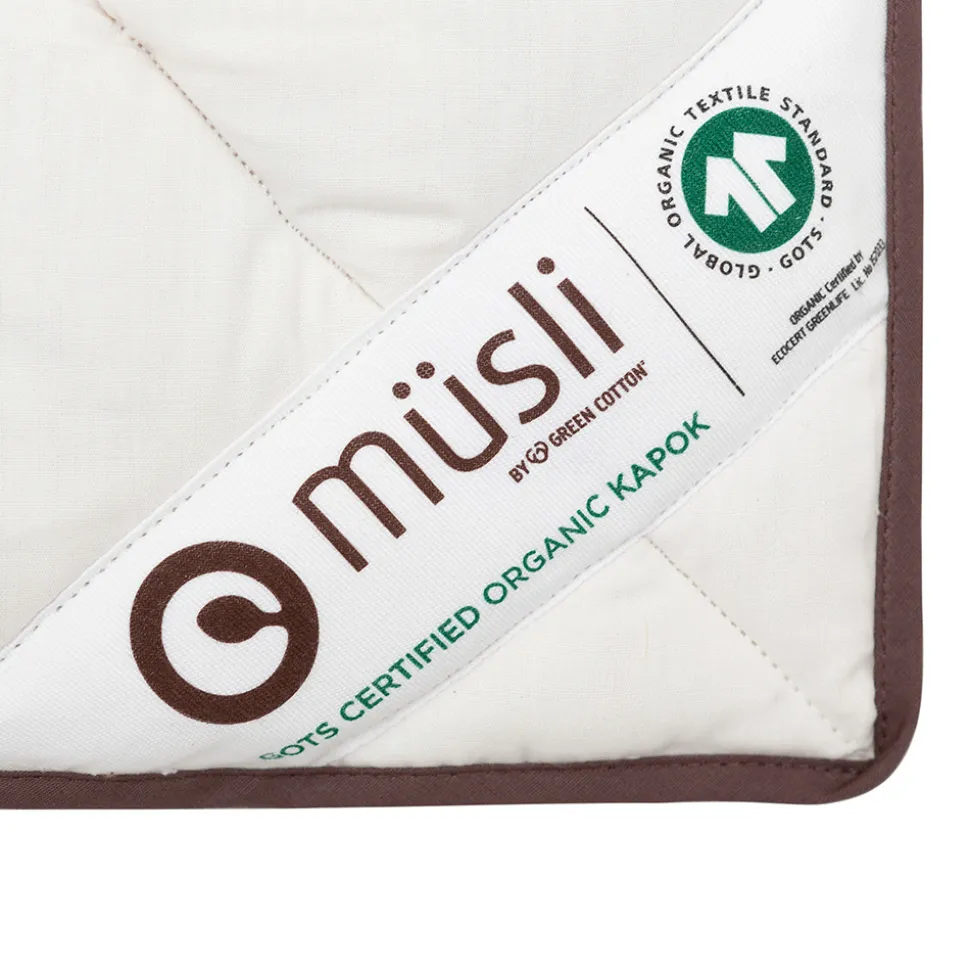 Müsli kapokpuden er lavet af rene plantefibre og er perfekte for folk med allergier. Puden er GOTS certificeret, betrækket er 100% økologisk GOTS certificeret bomuld og fyldet er 100% økologisk kapok. Kapok udvindes fra frøene fra kapoktræet, og er en hul fiber som består af 80% luft. Luften som er fanget i fiberen giver kapokken en fremragende isoleringsevne, og gør den til en af de letteste plantefibre i verden. Kapok er dejlig luftig om sommeren og holder på varmen om vinteren. Derudover er hver kapok fiber betrukket med naturlig voks som afviser fugt, hvilket forebygger mug og gør dem perfekt til folk med støvmideallergi.