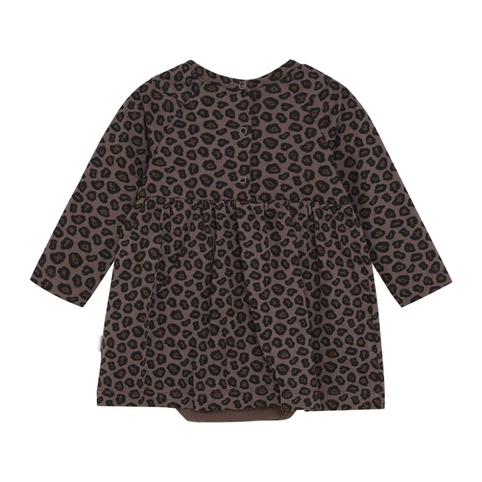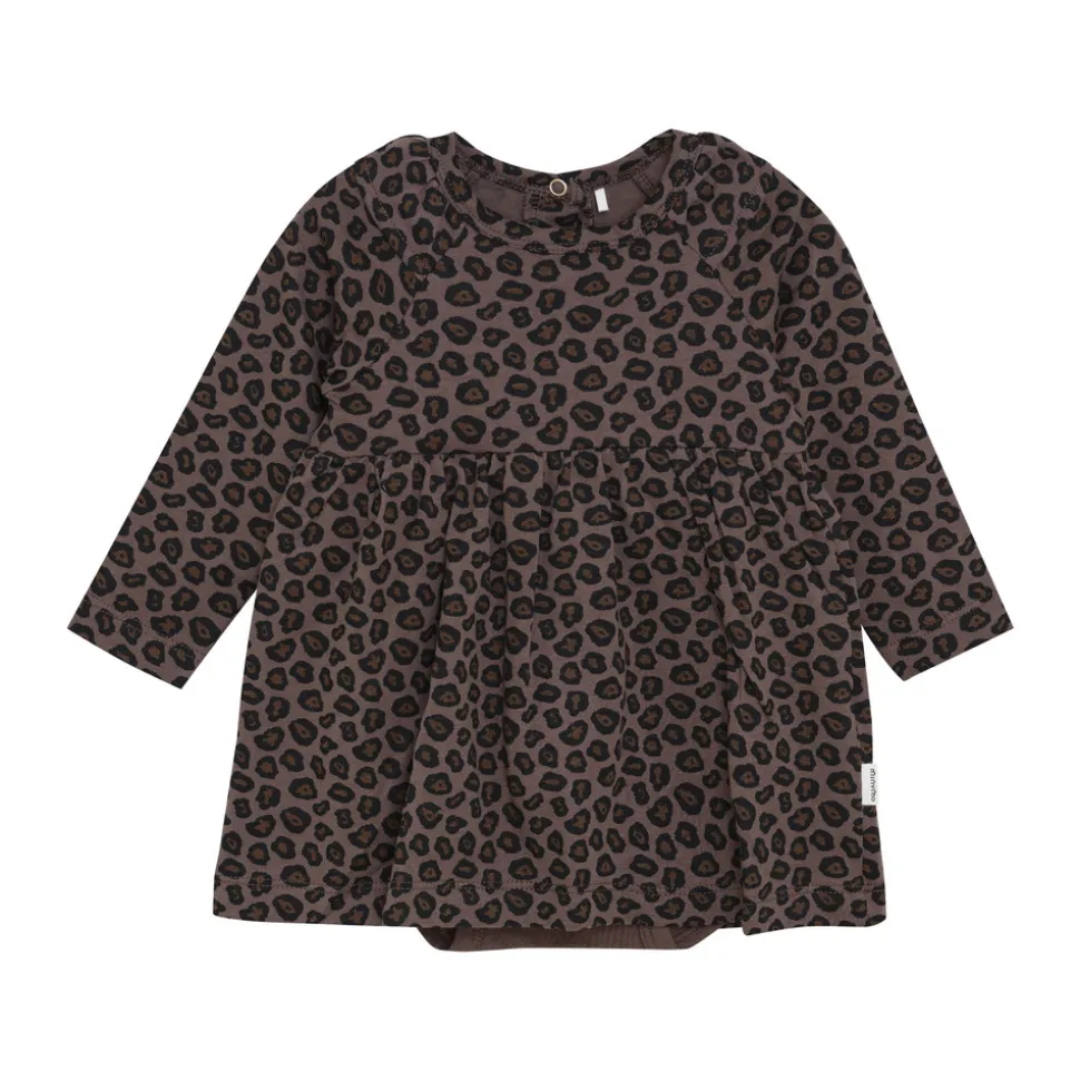 Den indbyggede body sikrer, at kjolen bliver, hvor den skal – også under leg. Fremstillet i en blød økologisk bomuldsblanding, der er skånsom mod barnets hud.
