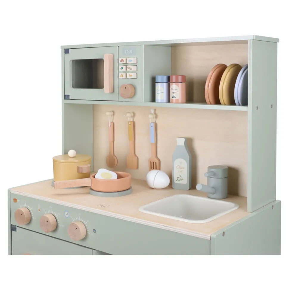Små kokke kan komme på arbejde i dette smukke mintfarvede legekøkken i træ! Bag en lækker kage i ovnen, tilbered friske grøntsager på komfuret, eller steg et æg på panden. Køkkenet er fuldt udstyret med to pander, køkkenredskaber, tre tallerkener og en vask til at vaske hænder. Der er også en flaske olivenolie, et salt- og pebersæt og et skab til opbevaring af madvarer. Mikrobølgeovnen har rigtige drejeknapper med illustrationer, som gør legen ekstra sjov. Hvad skal der laves i dag?